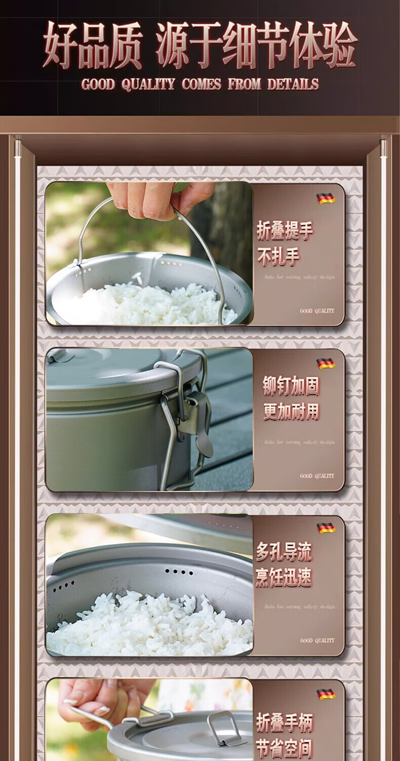 锅携带方便,比我之前买的那家要厚实。锅的做工都很好,无毛刺,物流运输途中没有被挤压磕碰到。户外煮大米饭很香。推荐给家人们