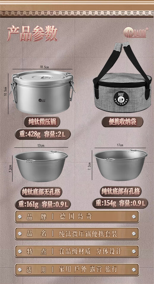 以前买过一些纯钛产品,纯钛是非常健康的材质,不惧酸碱。岛奇这款产品很久以前就注意到了,这次活动大下单,准备以后户外露营用,非常好,希望厂家继续推出更多新的纯钛产品。特别表扬快递小哥,派送太快了。