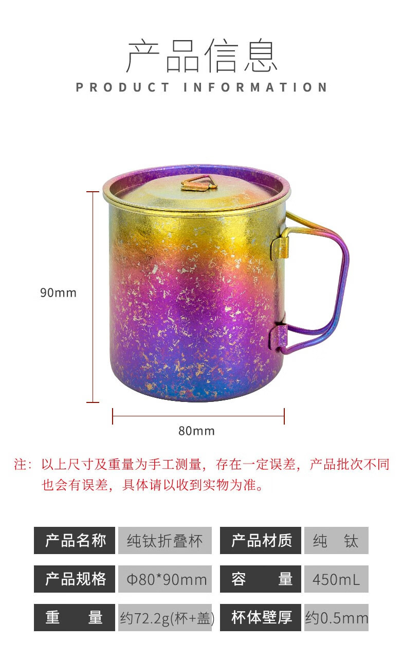 重量大小:确实非常轻,材质没问题,钛 产品做工:做工精良,大牌品质 缺点:容量有点虚标,比我 420ml 的其他牌子的折叠杯还小,同时买的 400ml 的公道杯倒满还有剩余,标 380 差不多 或者是不是发错了
