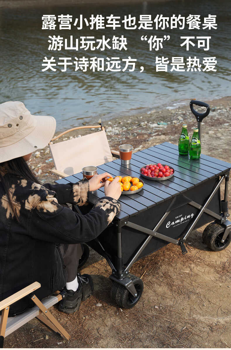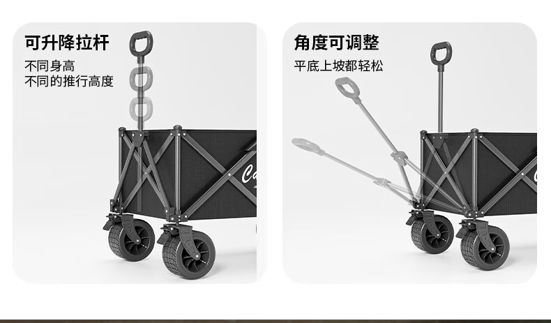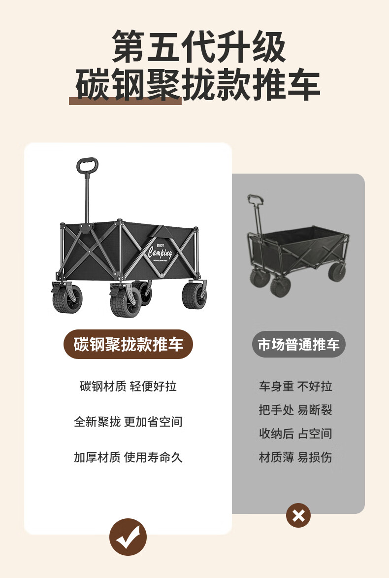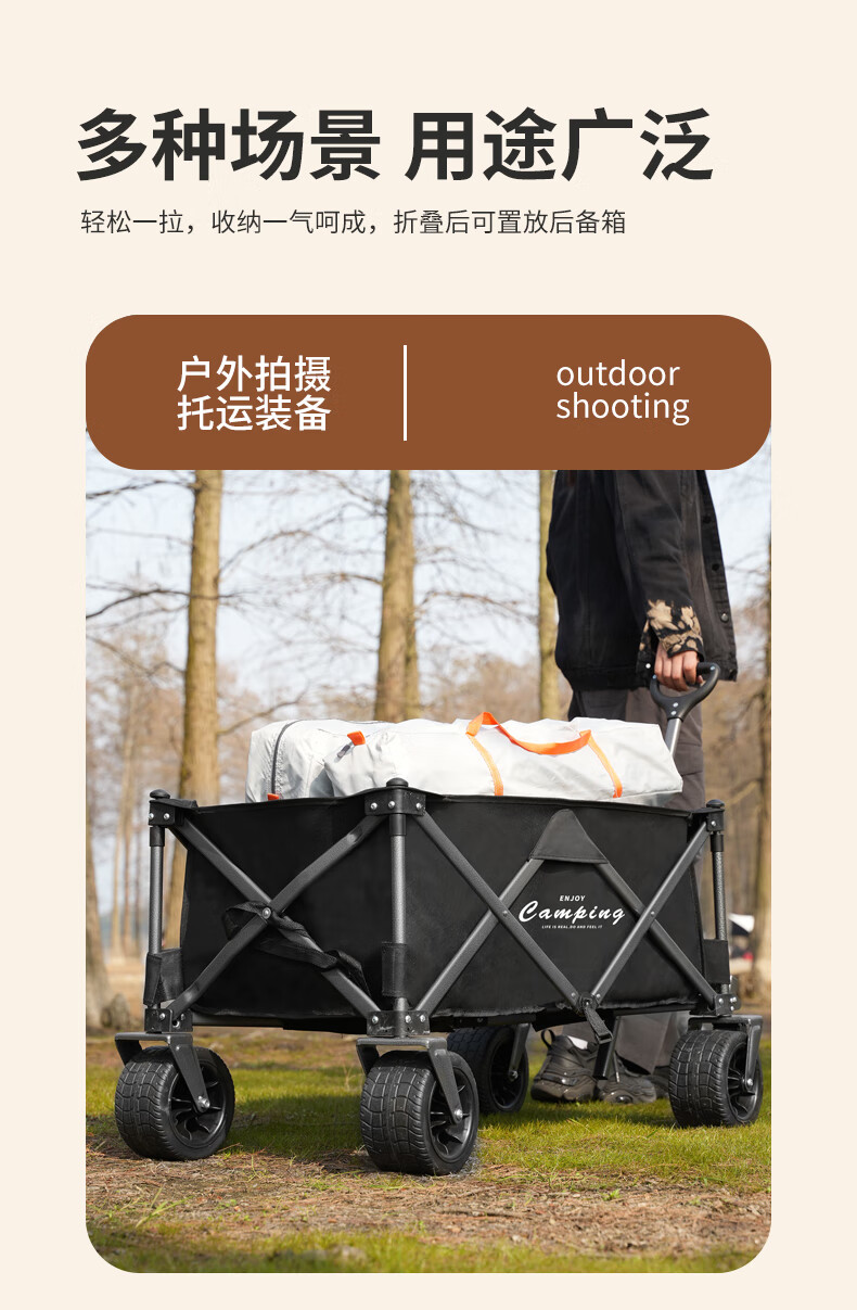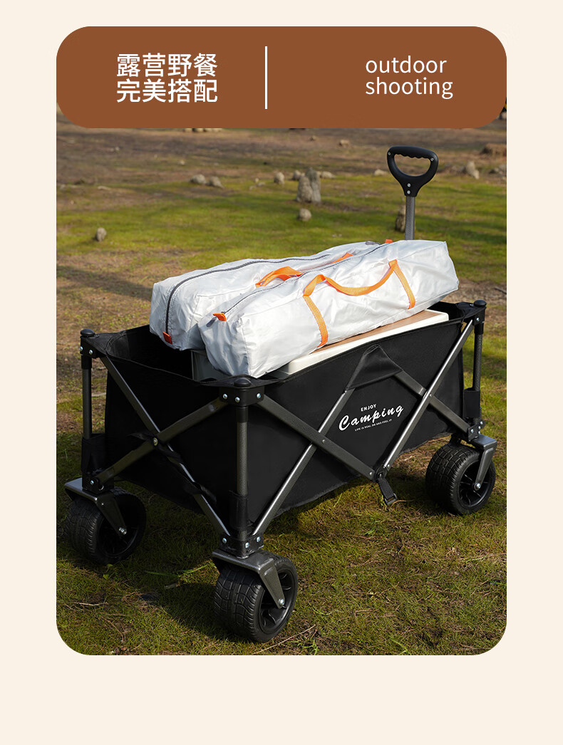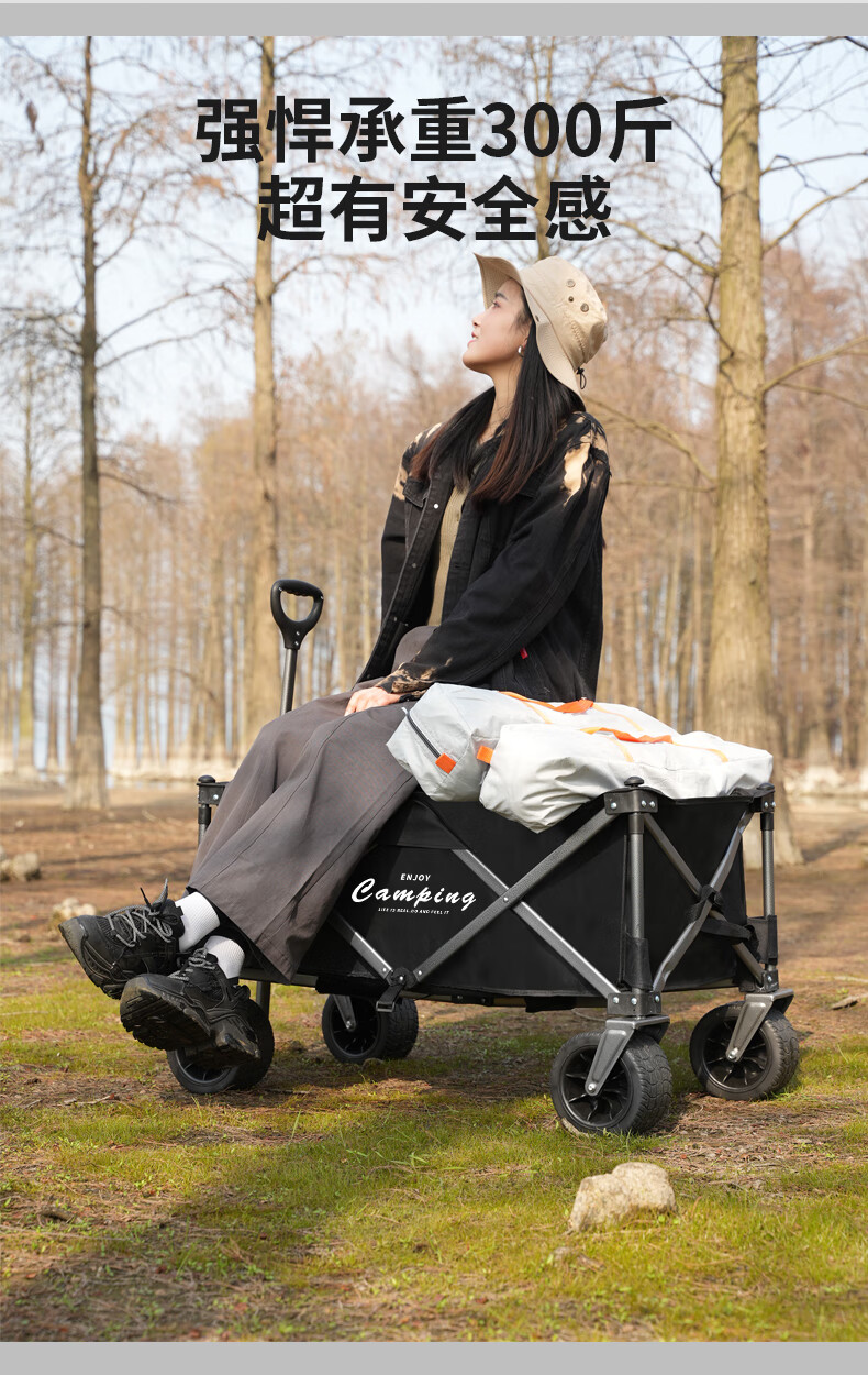 到货了,装起来真的稳得一批,拉着满营地转悠完全不晃,刹车也很灵敏,停坡上都不用担心溜车。收纳起来不占地,出远门超方便!