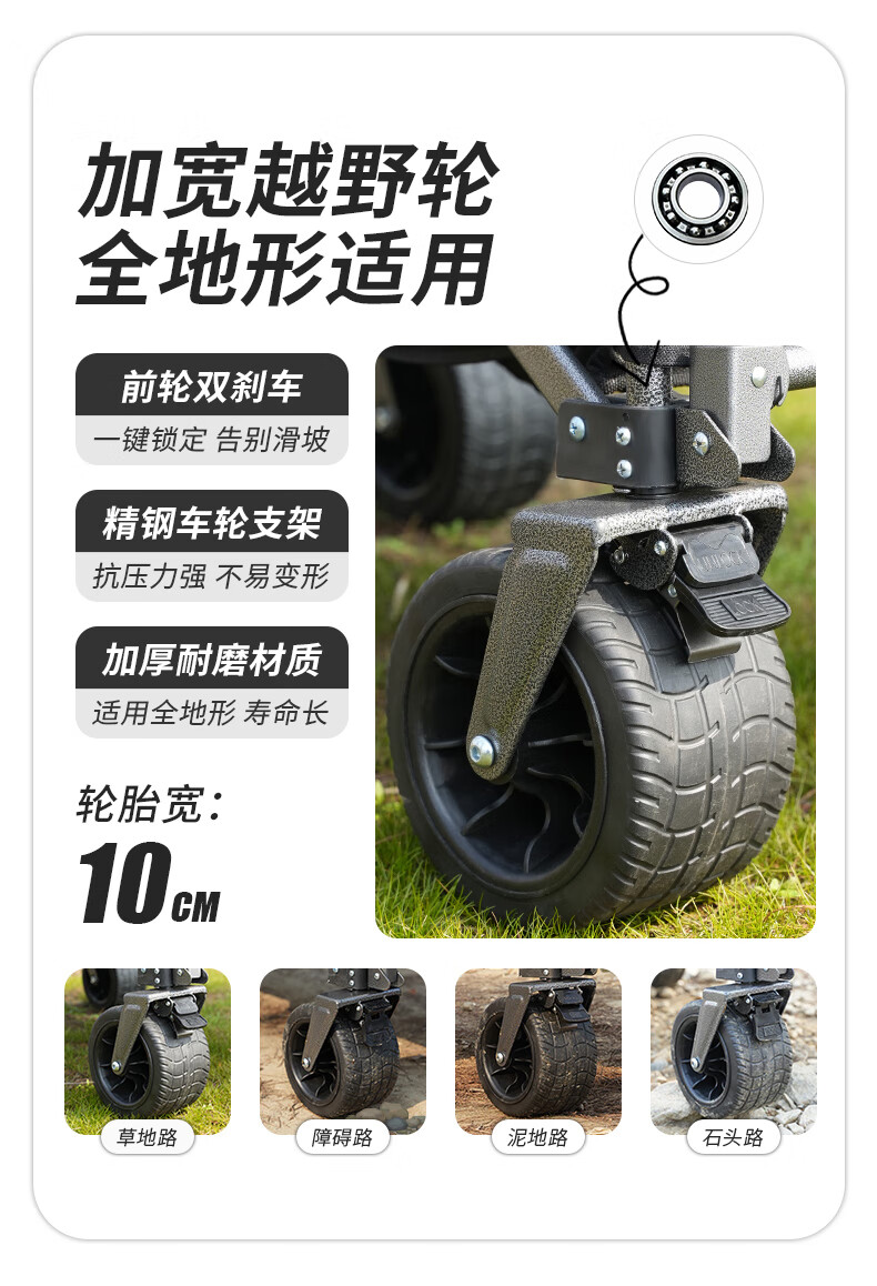 品质很不错的,使用这款露营车真是让我在户外活动中省了不少力气。它的越野性能非常出色,无论是沙地还是小石子路,都能轻松畅行。每次露营时,推着它走在营地上,感觉特别方便,能装下很多装备,真是个好帮手。设计也很人性化,折叠后不占地方,放在车后备箱里刚刚好。总之,体验非常满意。