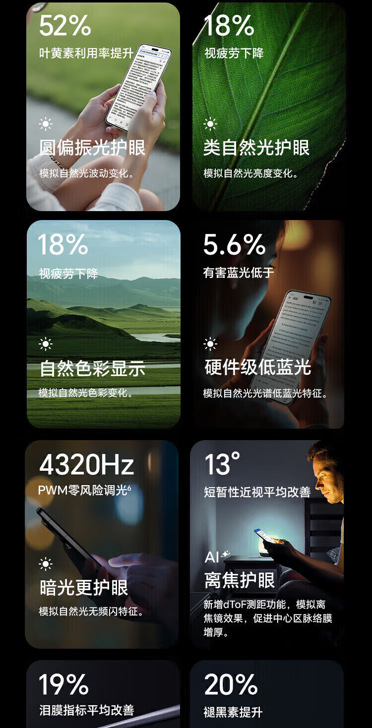 高频PWM调光;SGS认证;巨犀玻璃;德国莱茵护眼;LTPO屏幕