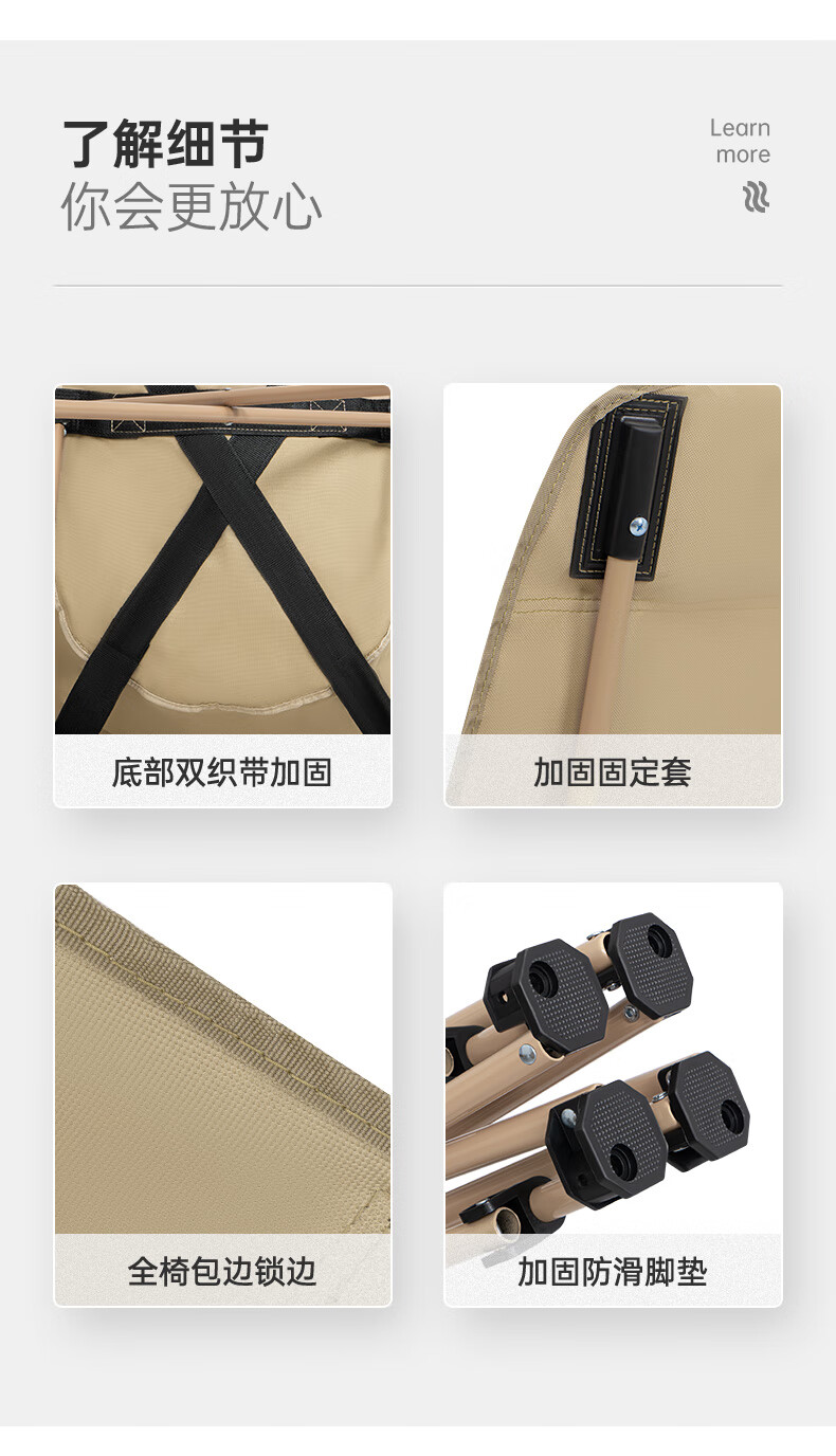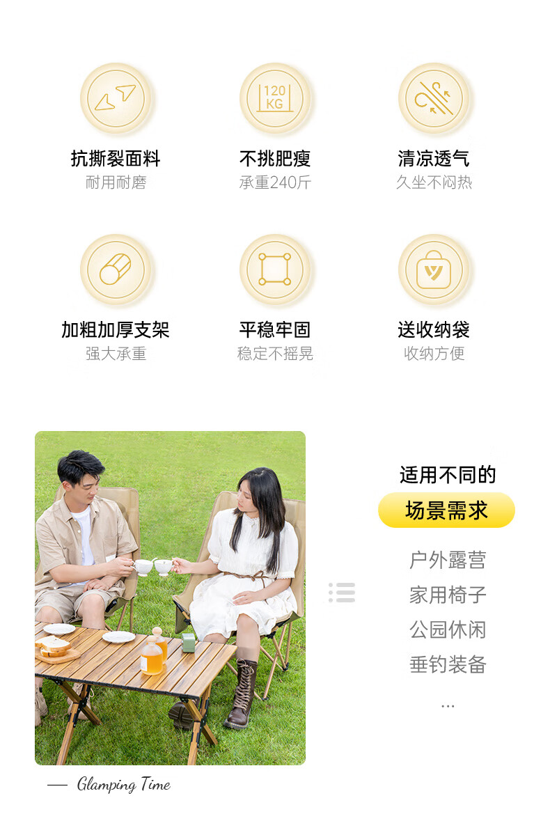 椅子设计的形状很合理,坐着很舒服。沙滩上也是可以用的,很多场景用着都很方便。携带也便捷,收放整理也很简单。材质很不错,挺结实的面料。侧边还有一个小兜,很方便放东西。京东买的也很实惠,喜欢。