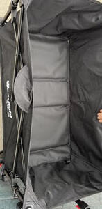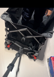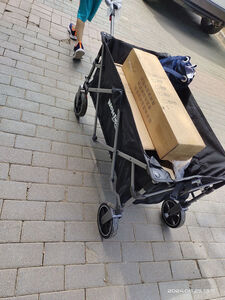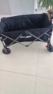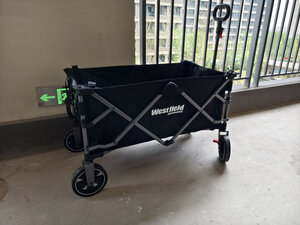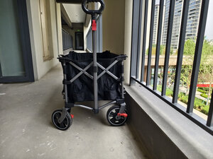 容量较大的一款露营车,计划就是在城里用的多,没有选择超宽轮,买了带桌板的平时用不上可以折叠收起来,折叠体积小打开可以放两个娃进去