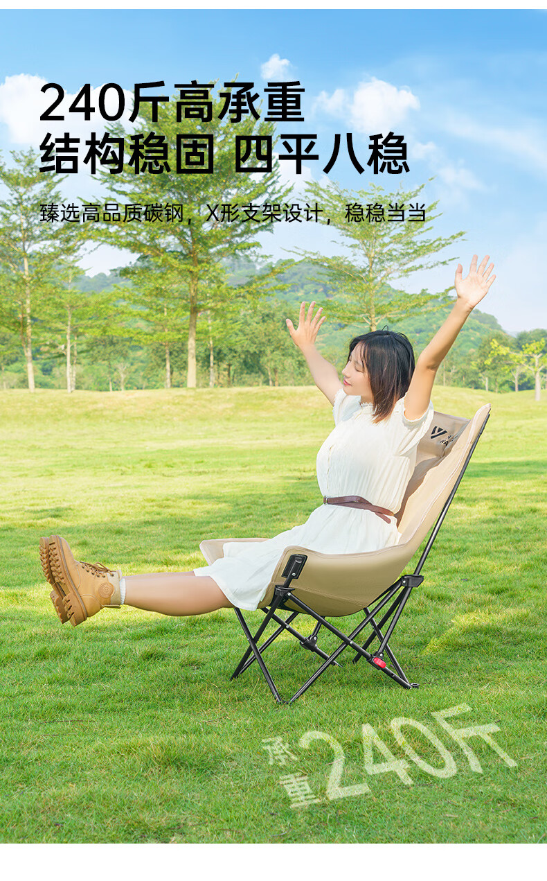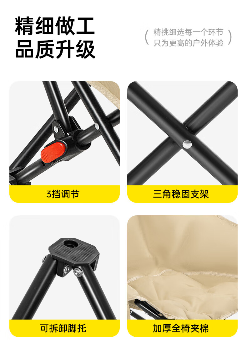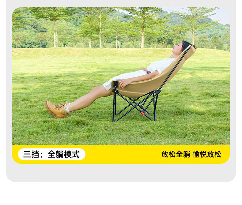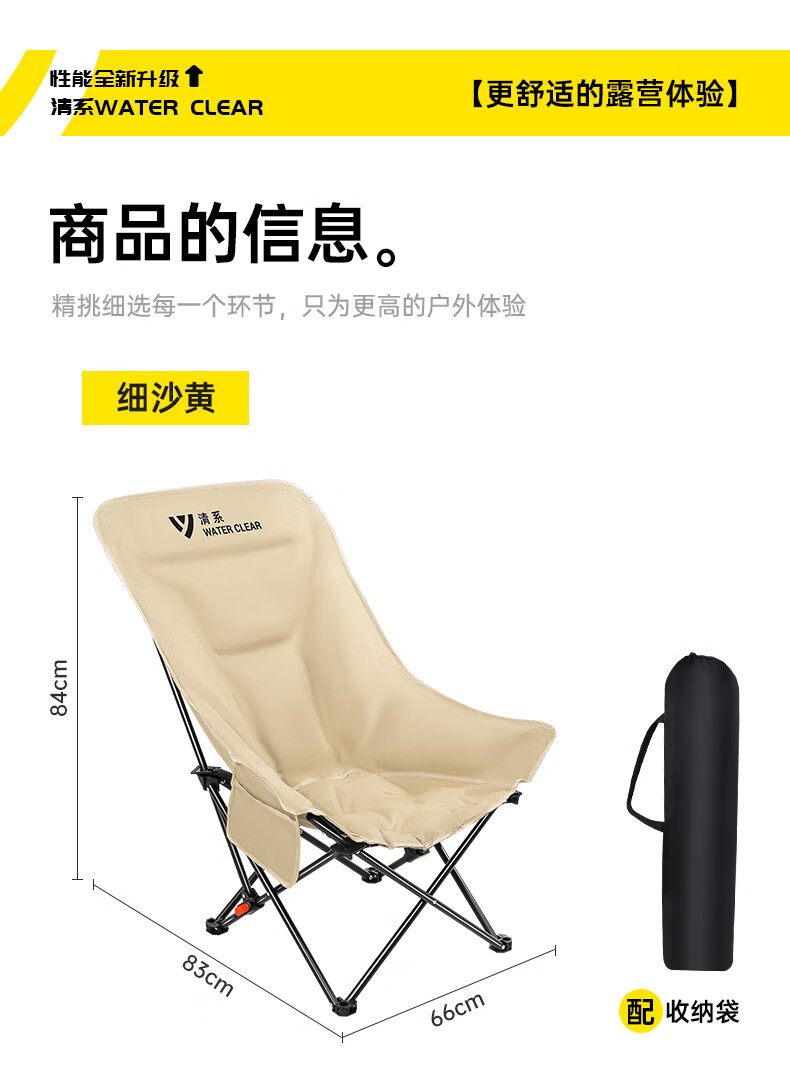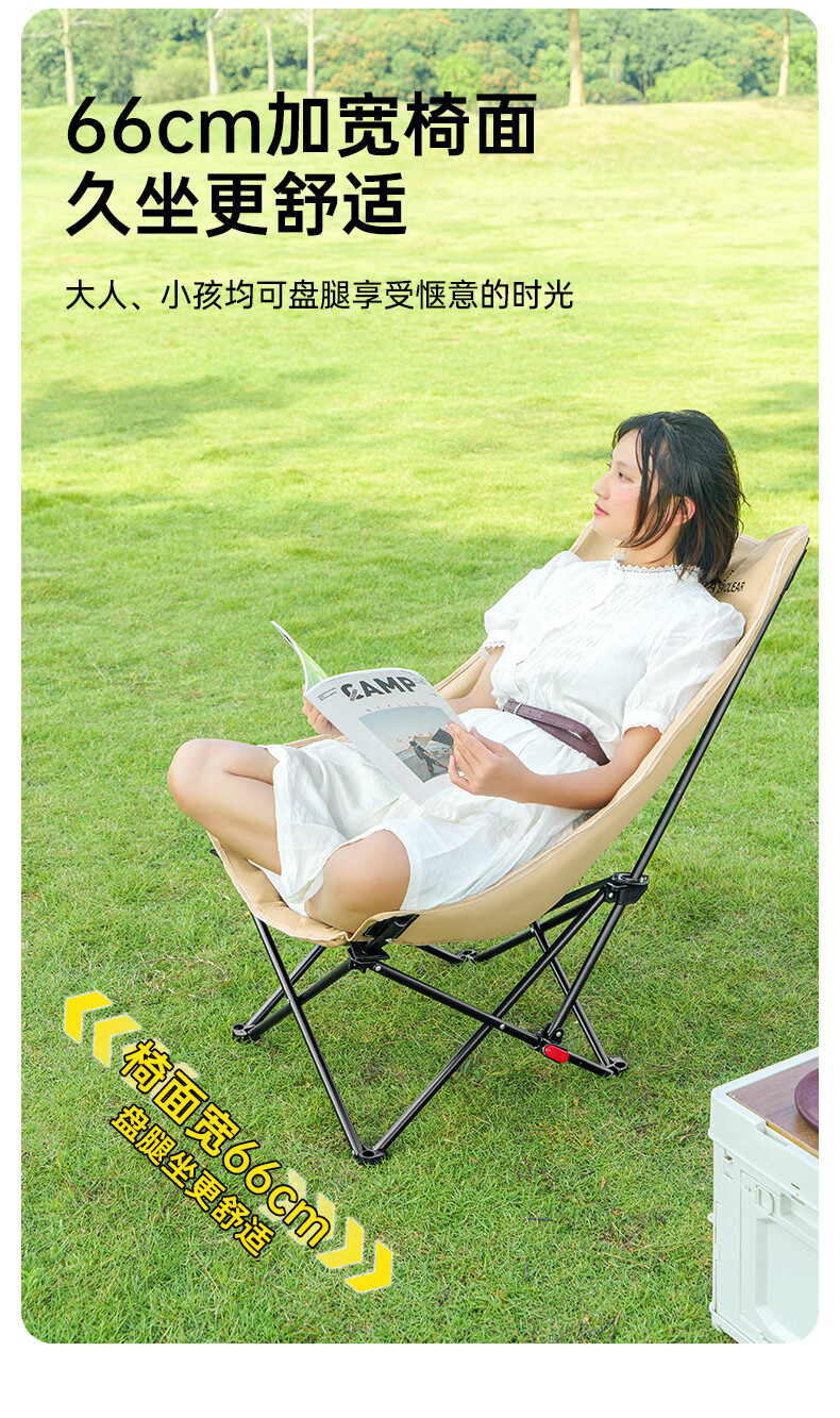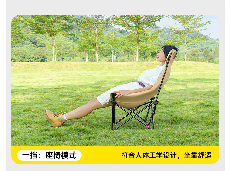 清系户外月亮椅,采用太空棉材质,坐感舒适。高靠背设计,支撑力强。细沙黄色调时尚百搭,适合露营、沙滩、钓鱼等多种场合。折叠便携,家用商用都方便,是一款性价比极高的休闲椅,值得推荐!