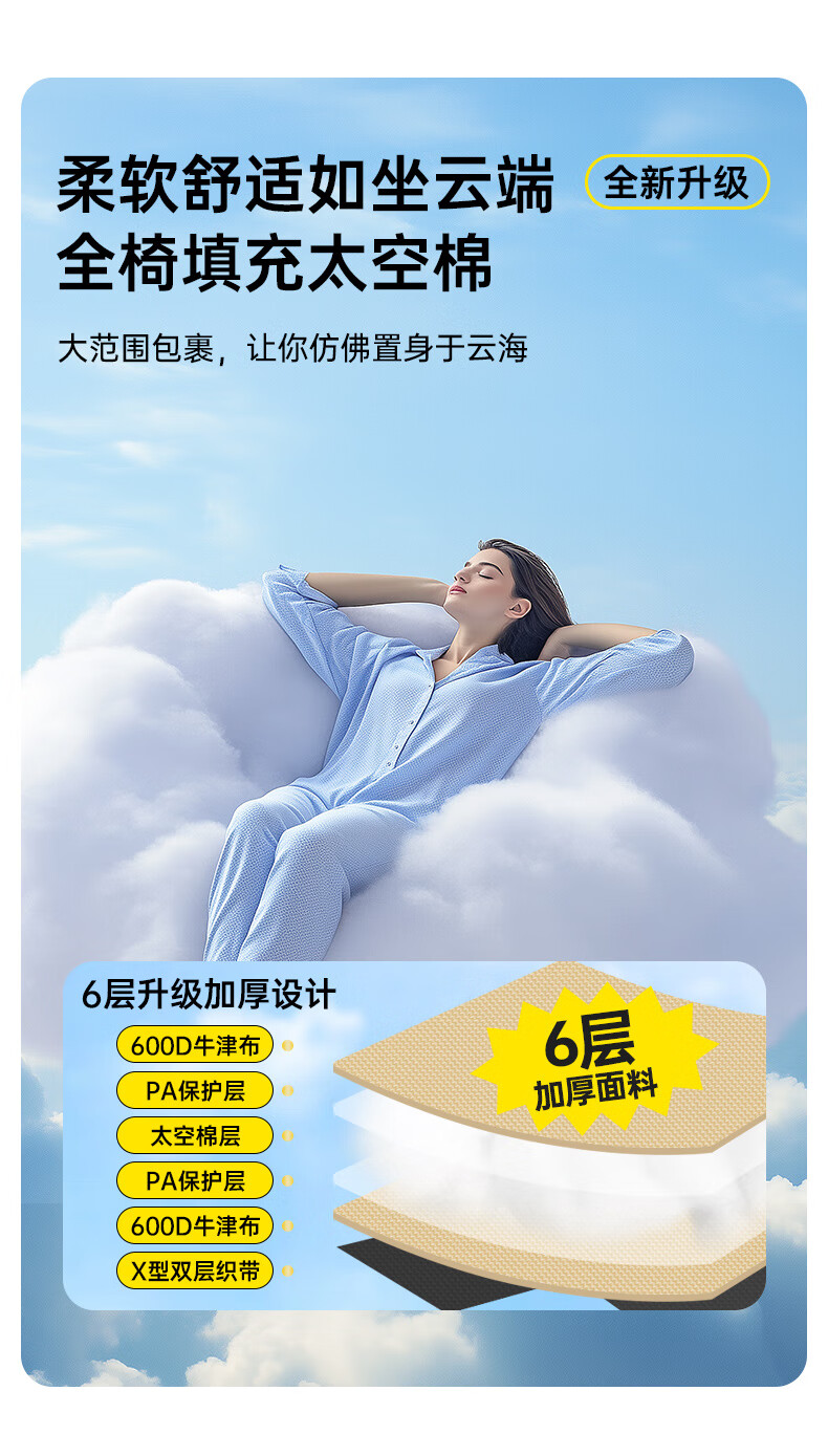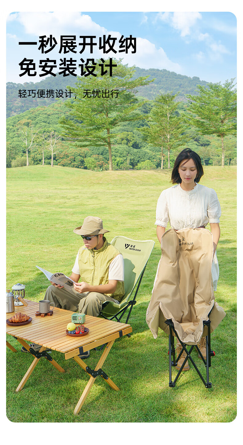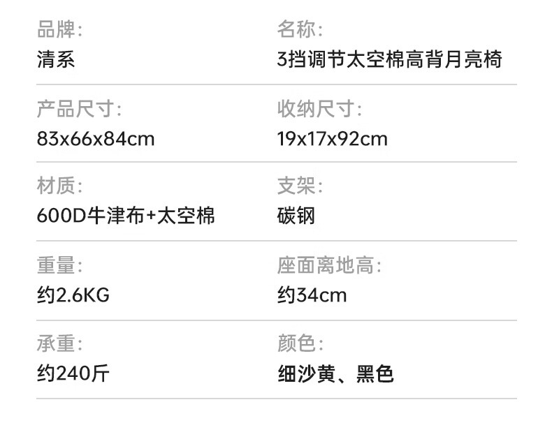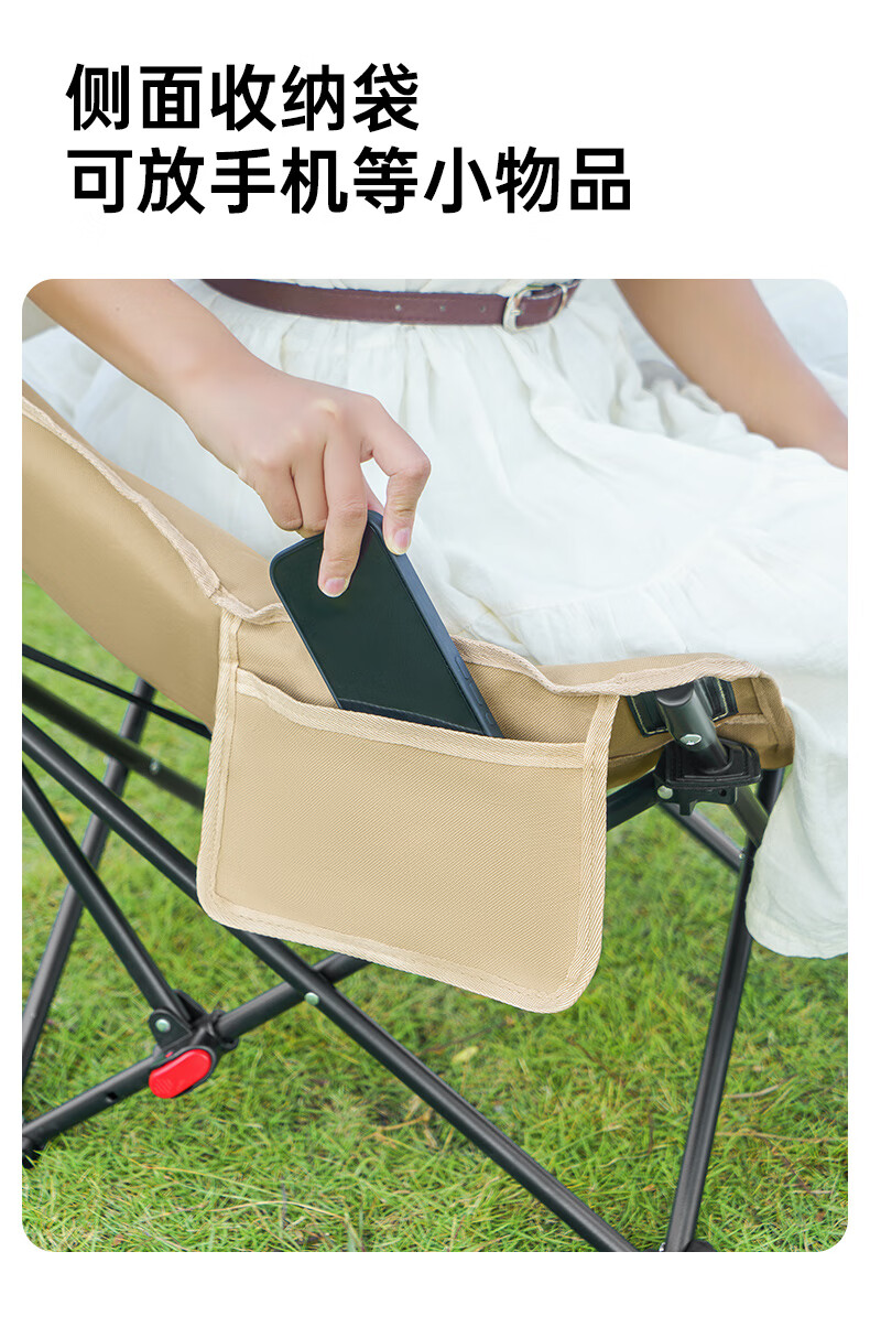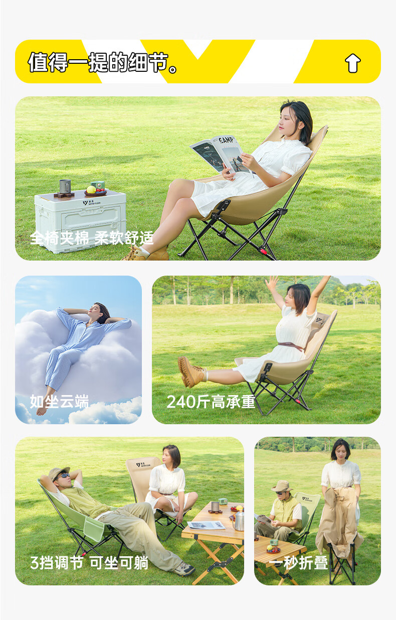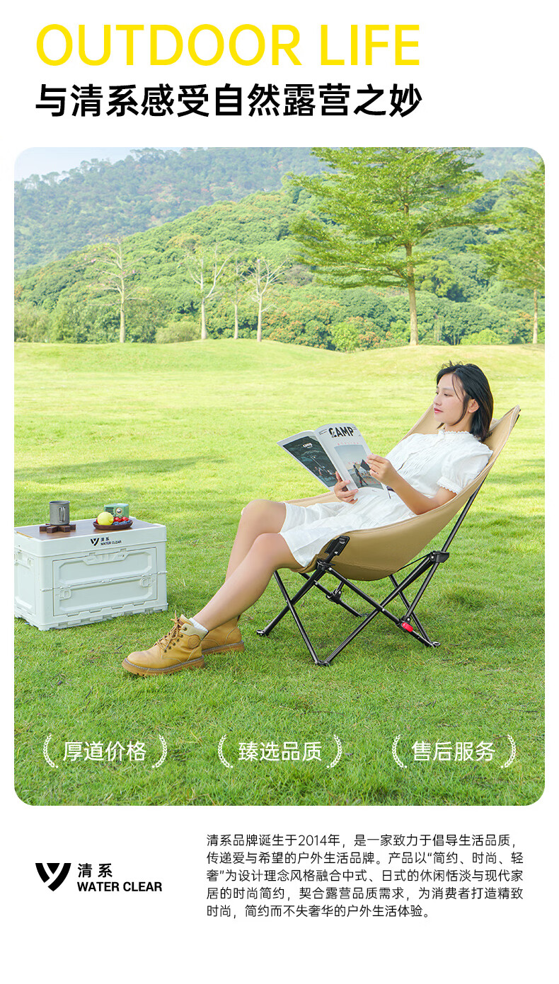 清系户外月亮椅,采用太空棉材质,坐感舒适。高靠背设计,支撑力强。细沙黄色调时尚百搭,适合露营、沙滩、钓鱼等多种场合。折叠便携,家用商用都方便,是一款性价比极高的休闲椅,值得推荐!