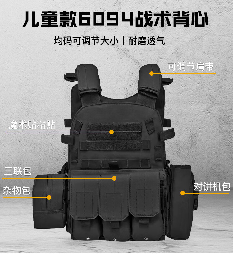 入手这款儿童防弹衣迷彩战术背心6094真的太值了!从拿到手那一刻就被它的质感惊艳到,暗夜迷彩的外观超酷,孩子穿上瞬间化身“小小特种兵”,帅气值拉满,搭配赠送的2个魔术贴,还能DIY专属造型,成就感十足! 作为户外装备,它的功能性堪称一绝!采用的材质结实耐用,透气设计超贴心,即使孩子疯跑疯玩出汗,也不会闷热难受。防护性能也很靠谱,虽然不是真的防弹,但应对户外玩耍时的小磕碰、树枝剐蹭完全没问题,防刺效果也让人安心。 细节更是满分!各种口袋设计合理,孩子的小玩具、水壶都能轻松收纳;调节扣灵活方便,能根据孩子身形自由调整,穿着舒适又贴合。不管是露营探险,还是玩真人CS游戏,这件背心都派上了大用场,孩子玩得尽兴,家长也更放心,强烈推荐给家里有“户外小达人”的朋友们!