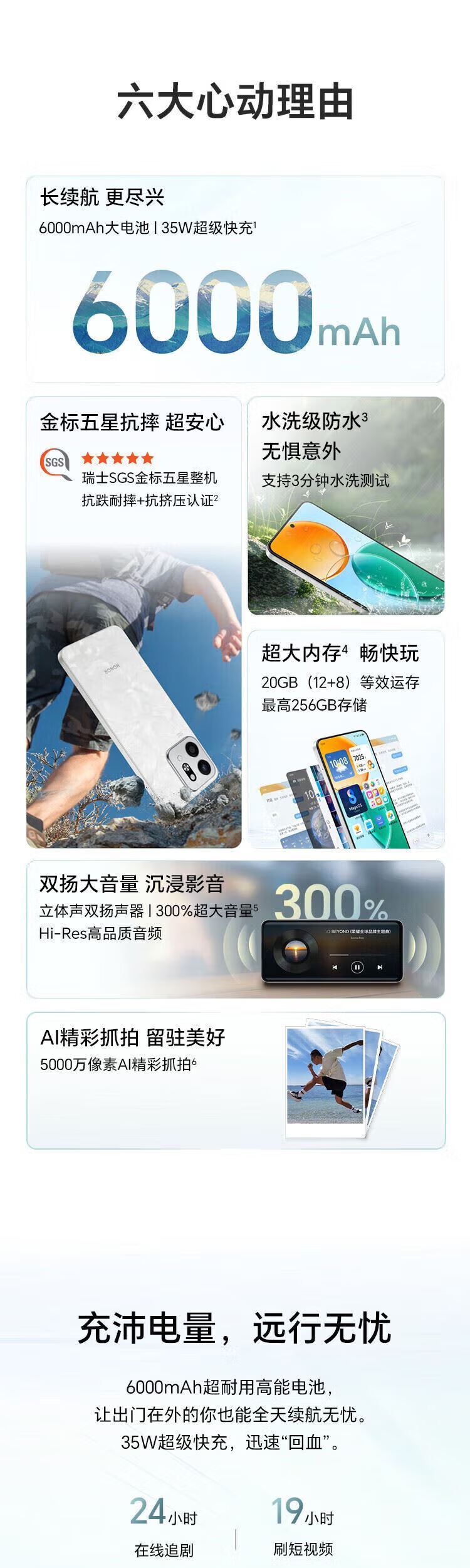 荣耀play9T【24期免息】5G全网通 新款 6000mAh超耐久大电池 防水抗跌高品质 300%双扬大音量 AI智能 松石绿 8GB-128GB【晒图赠蓝牙耳机】 官方正品【赠2年店铺延保+90天碎屏保】