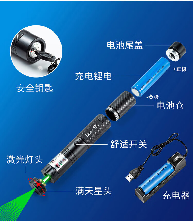 铁稳303大功率绿光激光手电USB充电远射激光笔灯售楼沙盘户外高亮指星 一电一充套餐