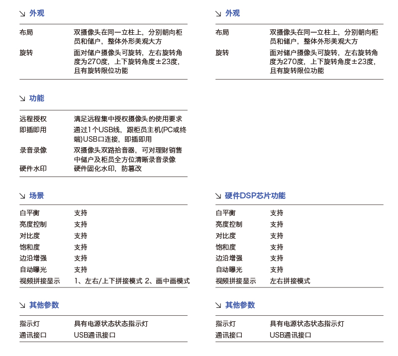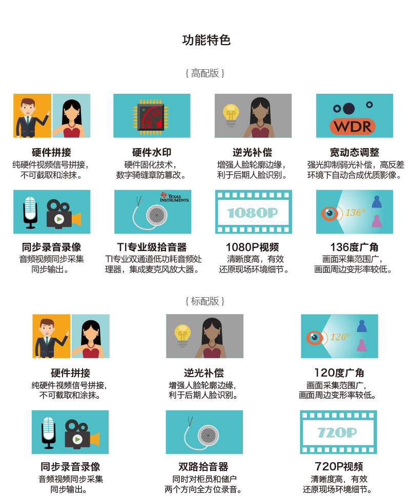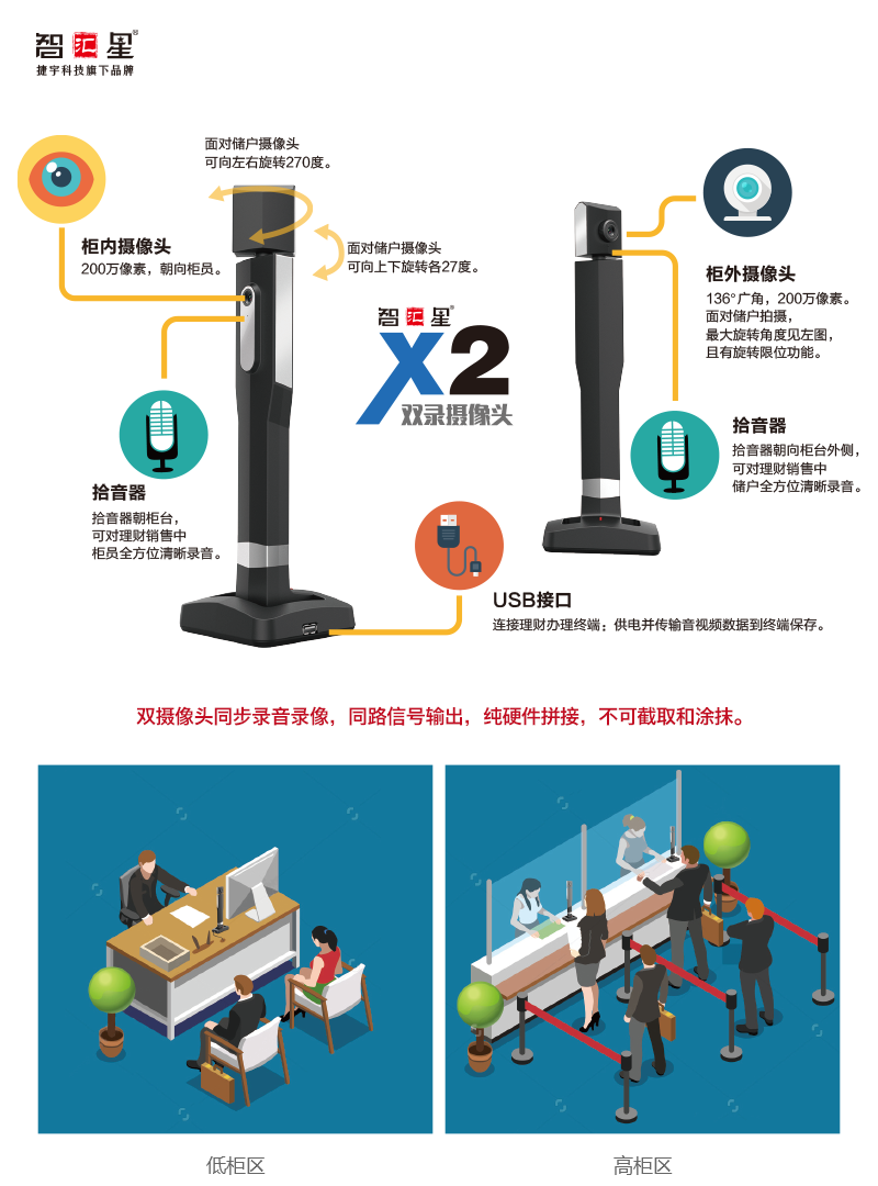 通过行业市场的需求调查分析,对不同类型的理财销售录音录像系统进行了深入了解后,结合实际情况,研发出双录摄像头,以音视频方式记录营销人员在销售理财产品时就产品的关键信息和风险向客户进行提示的过程,并根据产品类型设置影像文件的保存期限,以备需要时调阅、查询、下载、统计。