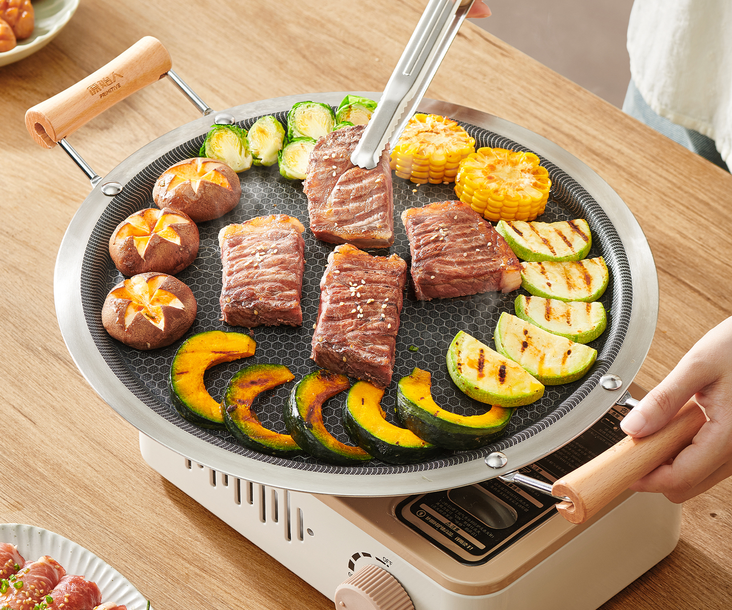 原始人烤肉盘不沾涂层不锈钢韩式烧烤盘家用无烟户外卡式炉圆形燃气灶 凸面款加大号特厚-食品级316