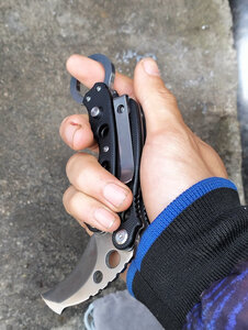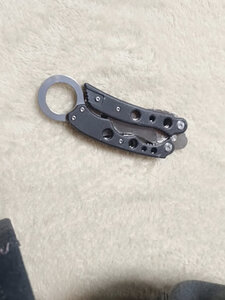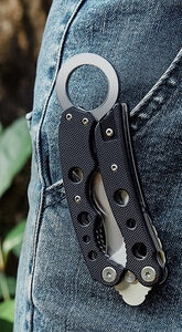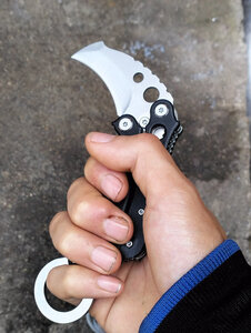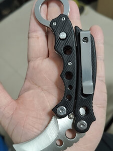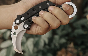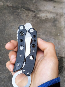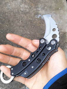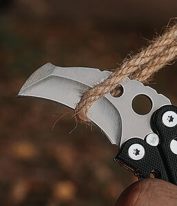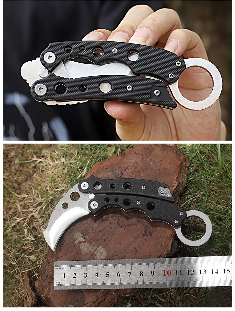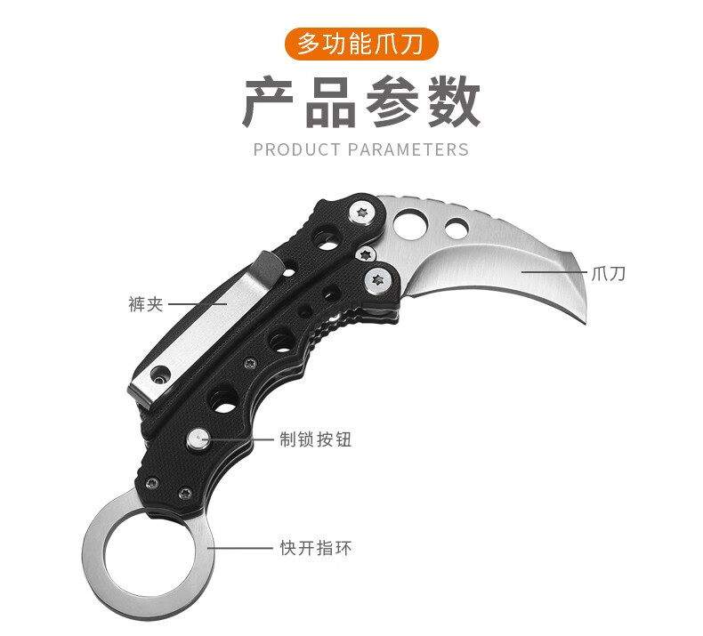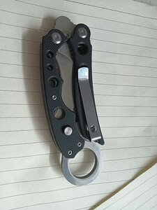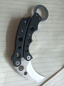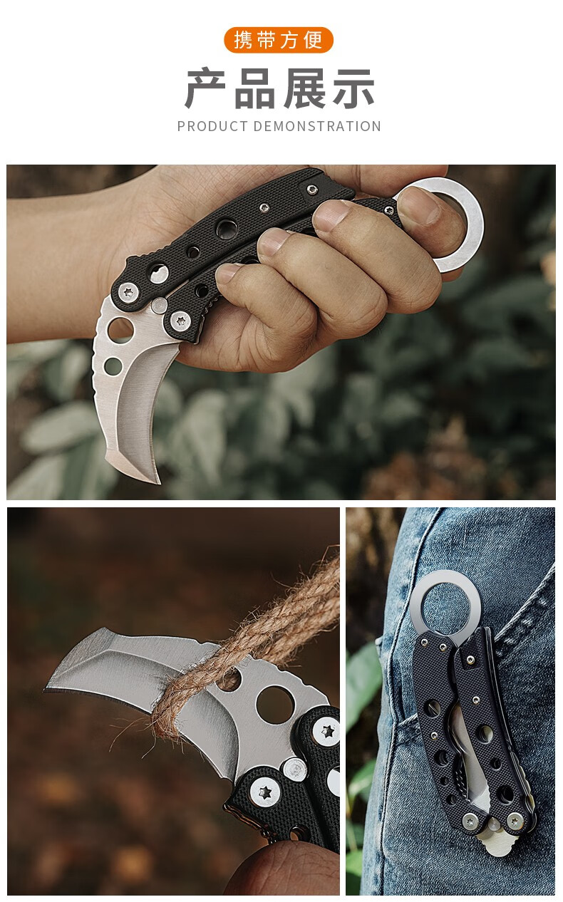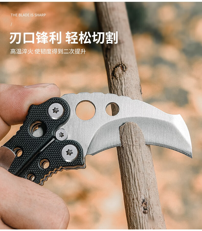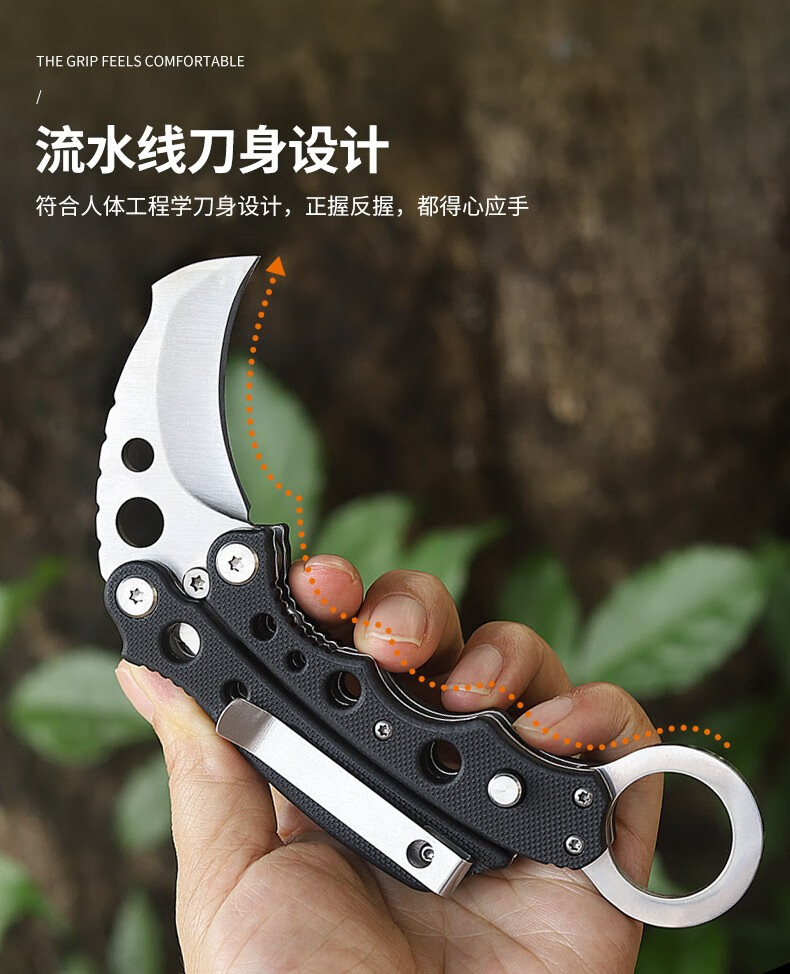 速度快,整体造型奇特,很类似于电影重生里面的镰刀状爪刀,呈镰刀状,向上勾起;不向其正常的爪刀,呈月牙状。但不是重生里主角所用的90度,大概110到120度左右的样子,刺击感会更强,切削感觉有点点削弱,比较适合是刺拉,采用***的锁定方式,开刃锁定很快,但收刃的时候,因为锁定装有弹簧,所以要额外操作一下才行,同时注意收刀和开刀的时候,千万不能碰锁定的那一个柄,不然的话,锁定栓插不准,造成锁定不稳,要类似于寸劲那样甩手,加快它自己去锁定。