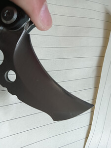 刃口锋利度磨的很好,削纸很丝滑无卡顿,热处理还不错砍实木桌子半厘米深口,刀身无卷刃崩口,锋利度依然丝滑是把好刀,爪刀力推