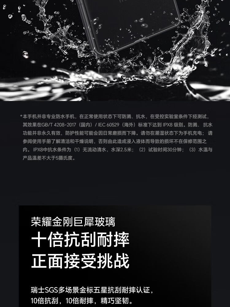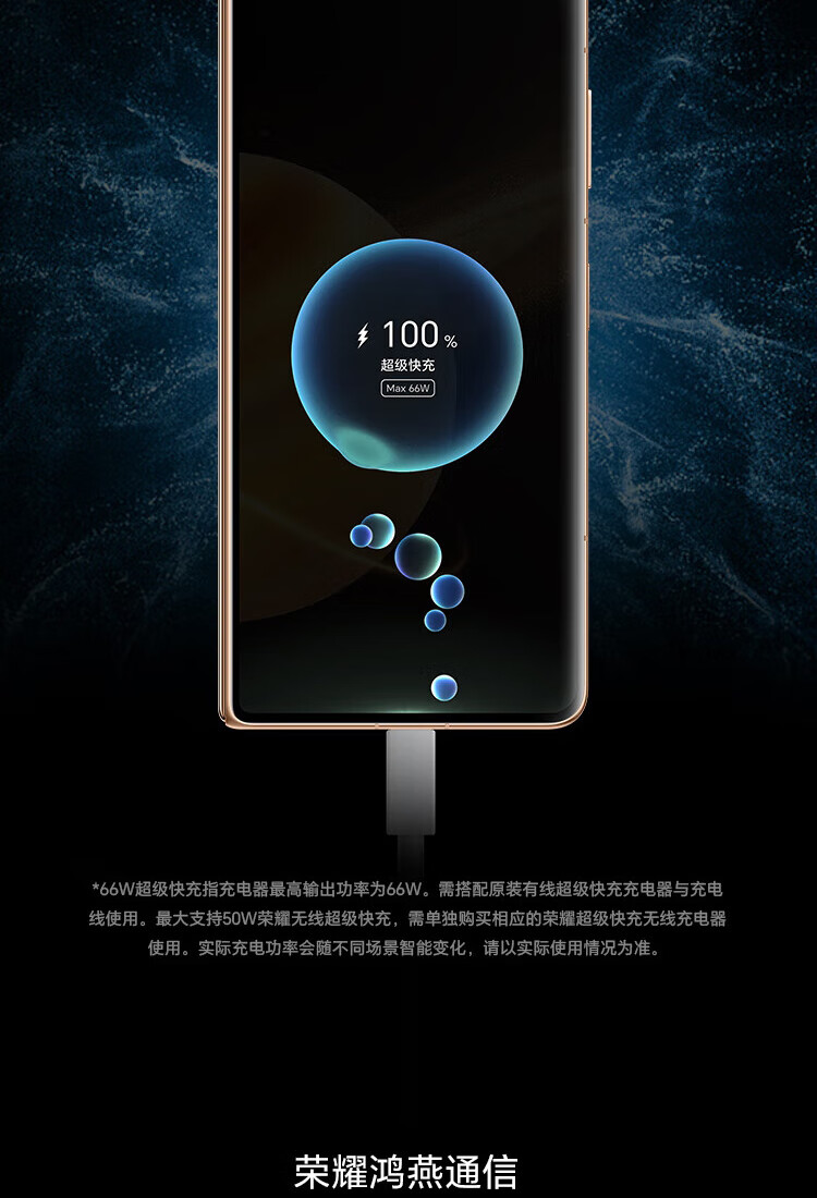外包装采用塑封,彩盒内标配: 1)手机(含内置电池) x 1 2)HONOR SuperCharge充电器 x 1 3)USB Type-C 数据线 x 1 4)快速指南 x 1 5)取卡针 x 1