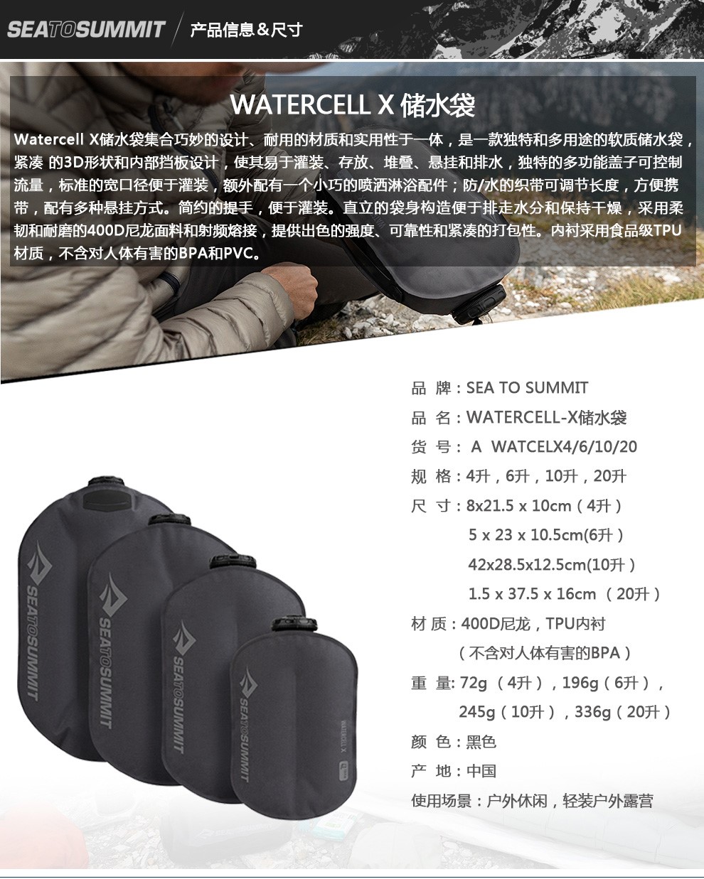SEA TO SUMMIT 澳大利亚户外徒步探险露营休闲用储水袋淋浴袋WATERCELL X 黑色 4升