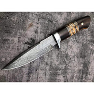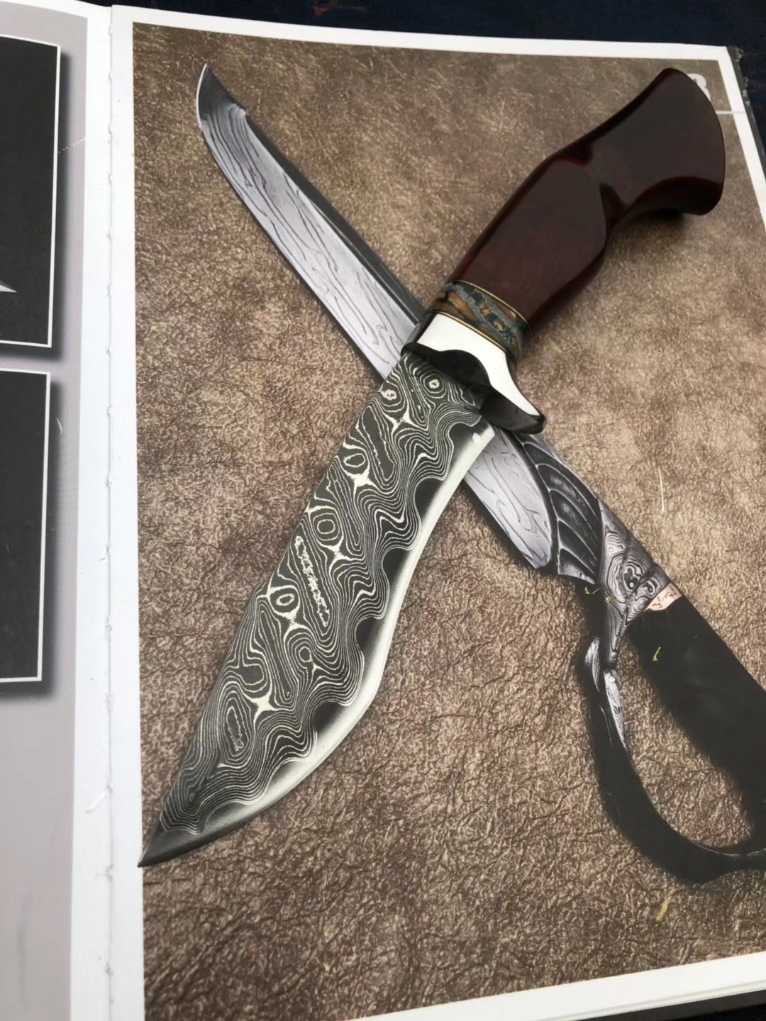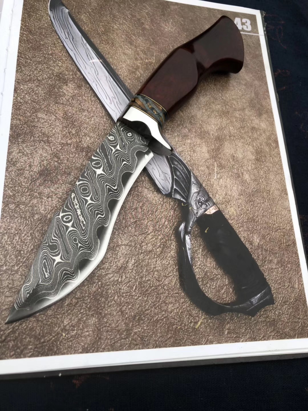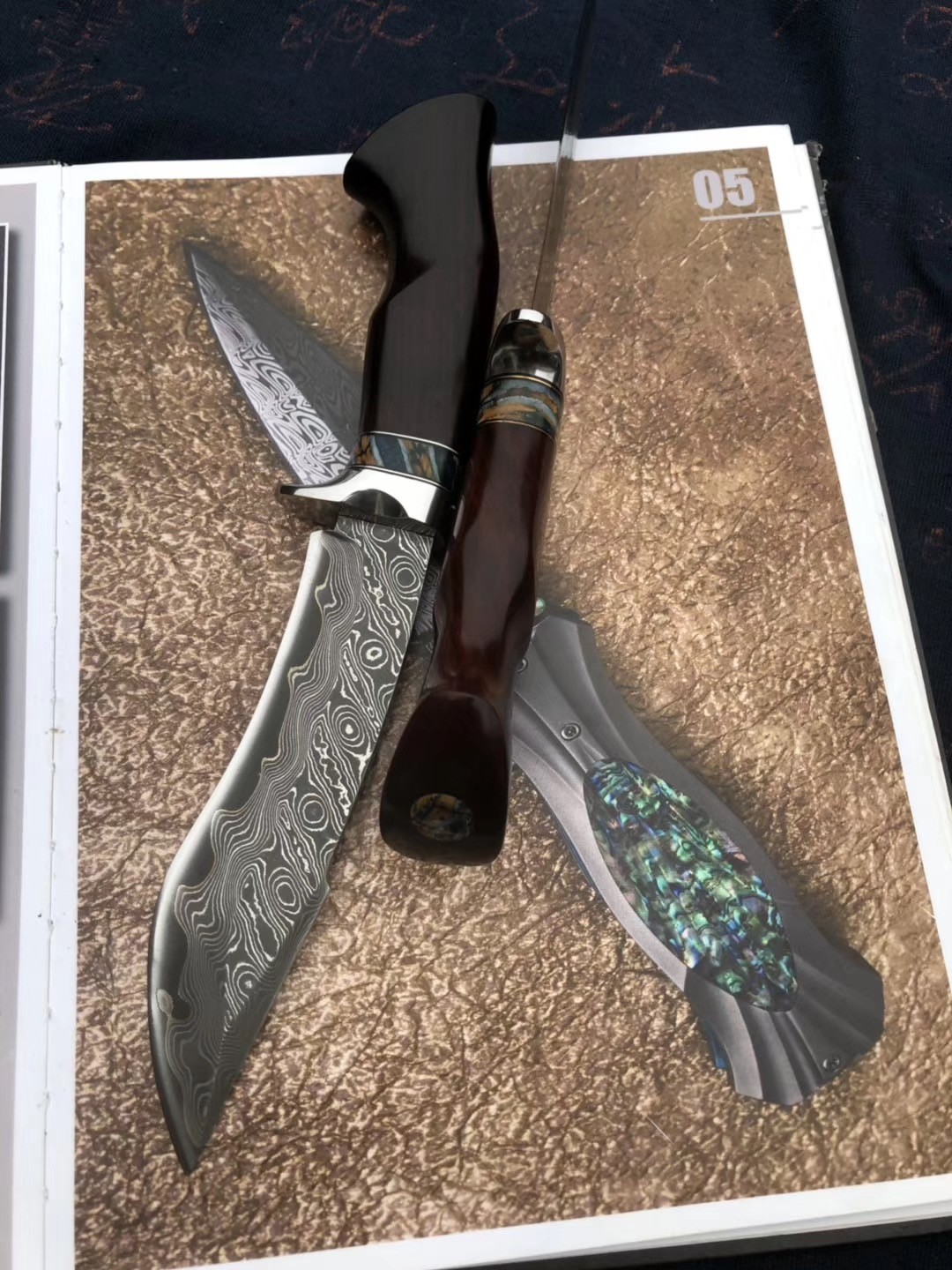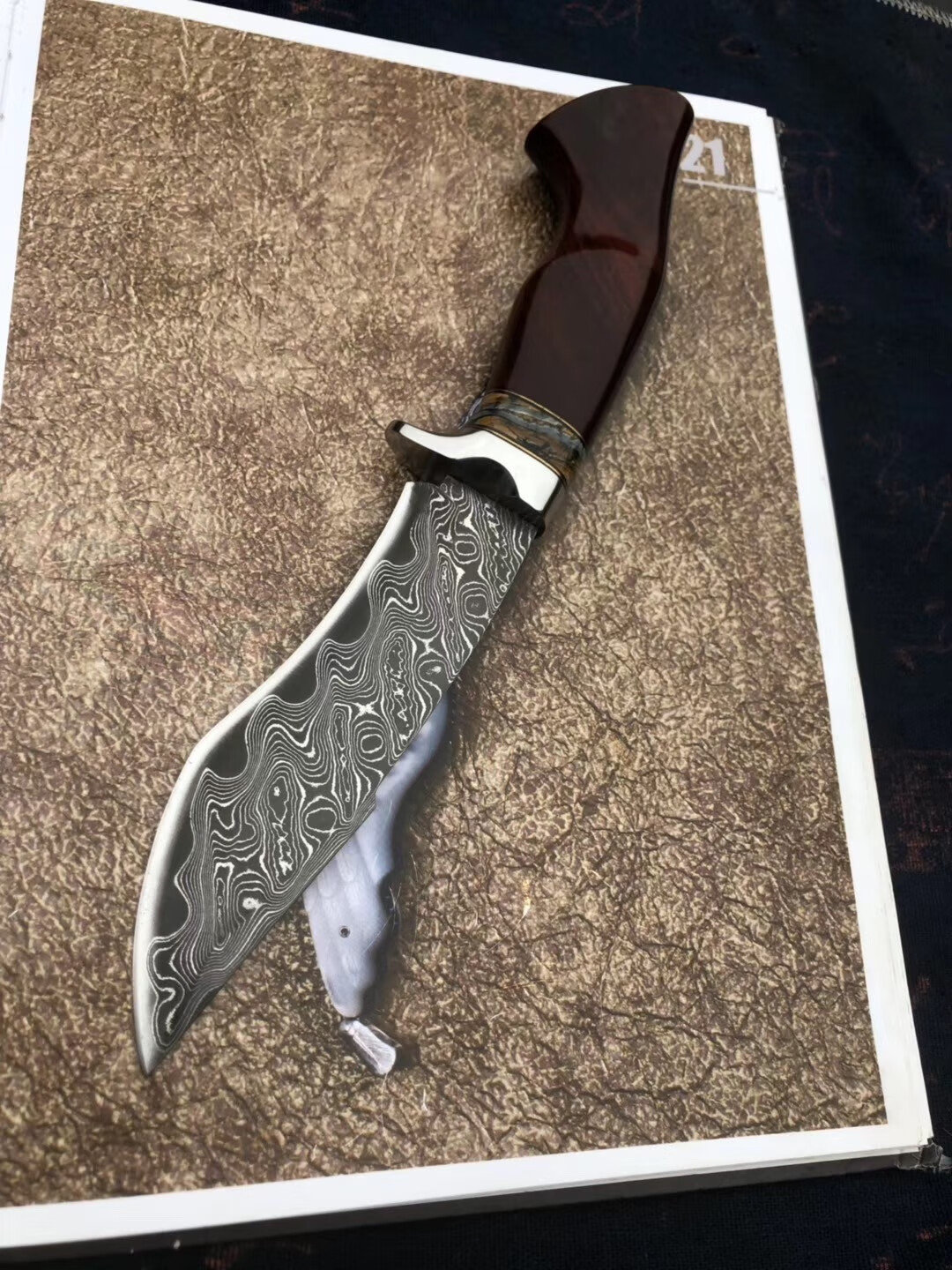 雨轩户外户外博弈直刀95层锻造大马士革钢刀云眼花纹刀身猛犸齿沙铁木手柄