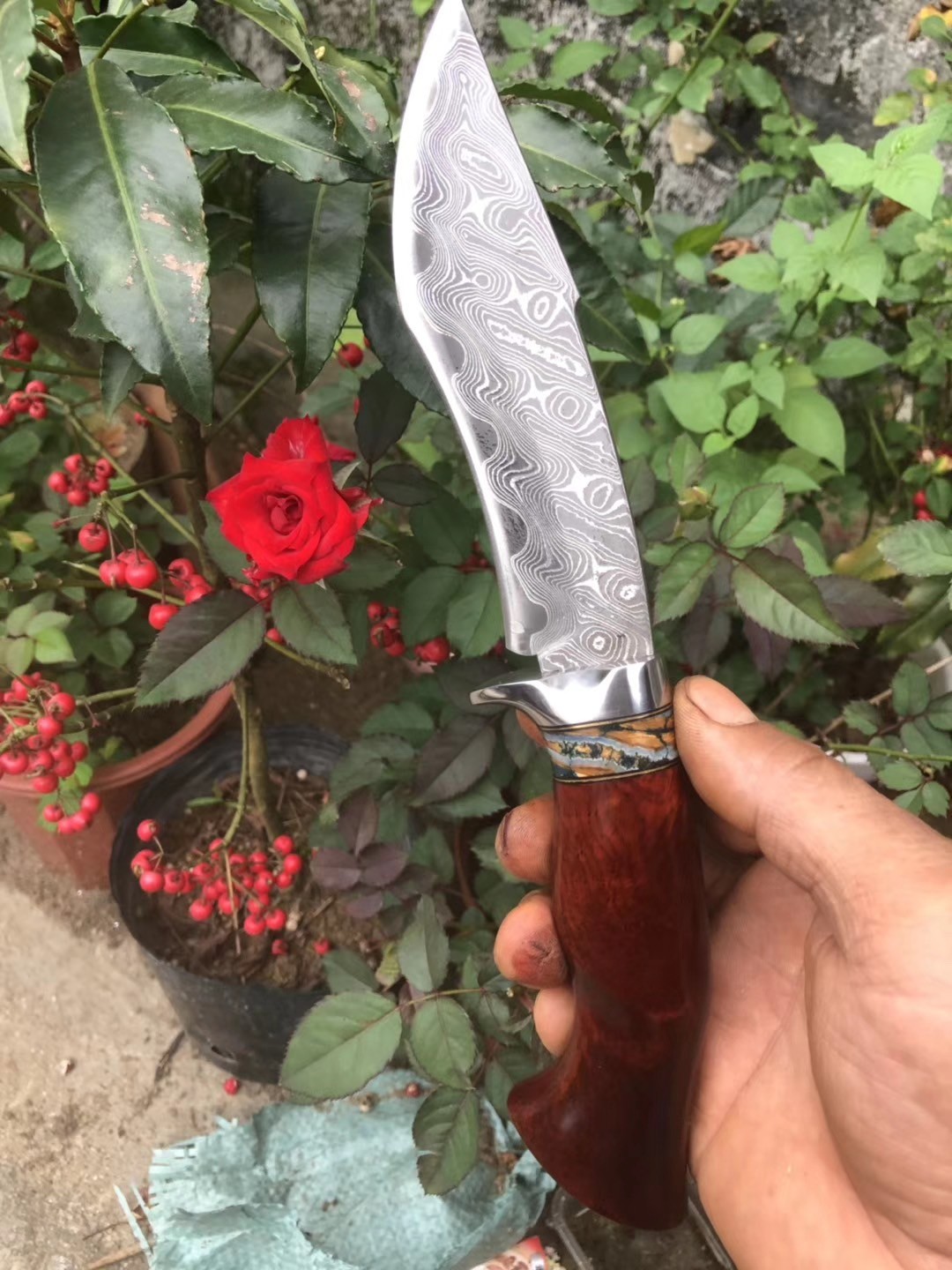雨轩户外 大马士革钢刀户外直刀红酸枝黄檀沙漠铁木猛马齿牙化石组合手柄