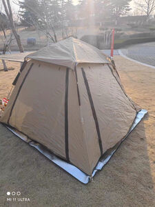 帐篷支起来非常简单快速,三分钟搞定,天幕也就是第一次需要绳结打扣,之后把绳子收好就可以非常快速完成了,帐内空间大,四个大人躺平完全没问题,坐着可以更多人,天幕也完全够移用