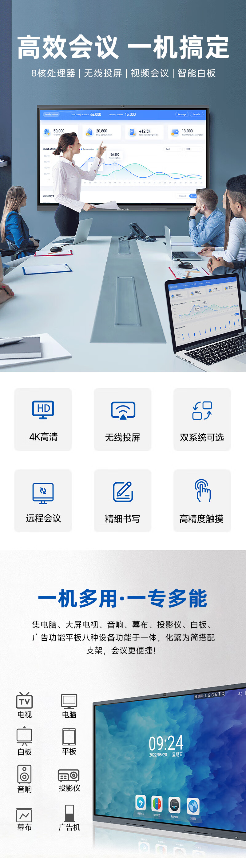 会议一体机教学家用多媒体触控屏电子白板智能投屏办公4K超清智慧屏教学触摸一体机55/65/75/85/100英寸 65LED触摸一体机+移动推车+运费险 单系统W10【i5/8+256G】教学推荐