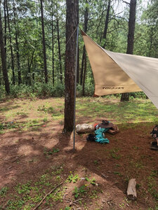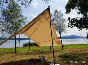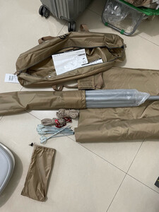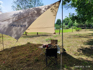天幕颜值不错,拼色很显档次。支撑杆和拉绳安装设计比较合理,能快速安装,地钉稍微软了一点,脚一踩就弯了,用锤子掰直后不影响使用。天幕的防晒效果一般,但是当初买的时候做了功课,专门考虑了采光和防晒的取舍,但是还是建议直接黑胶天幕走起。伯希和这个牌子是几年前偶然看见的,买过东西不少,基本没有失望的,伯希和靠谱。
