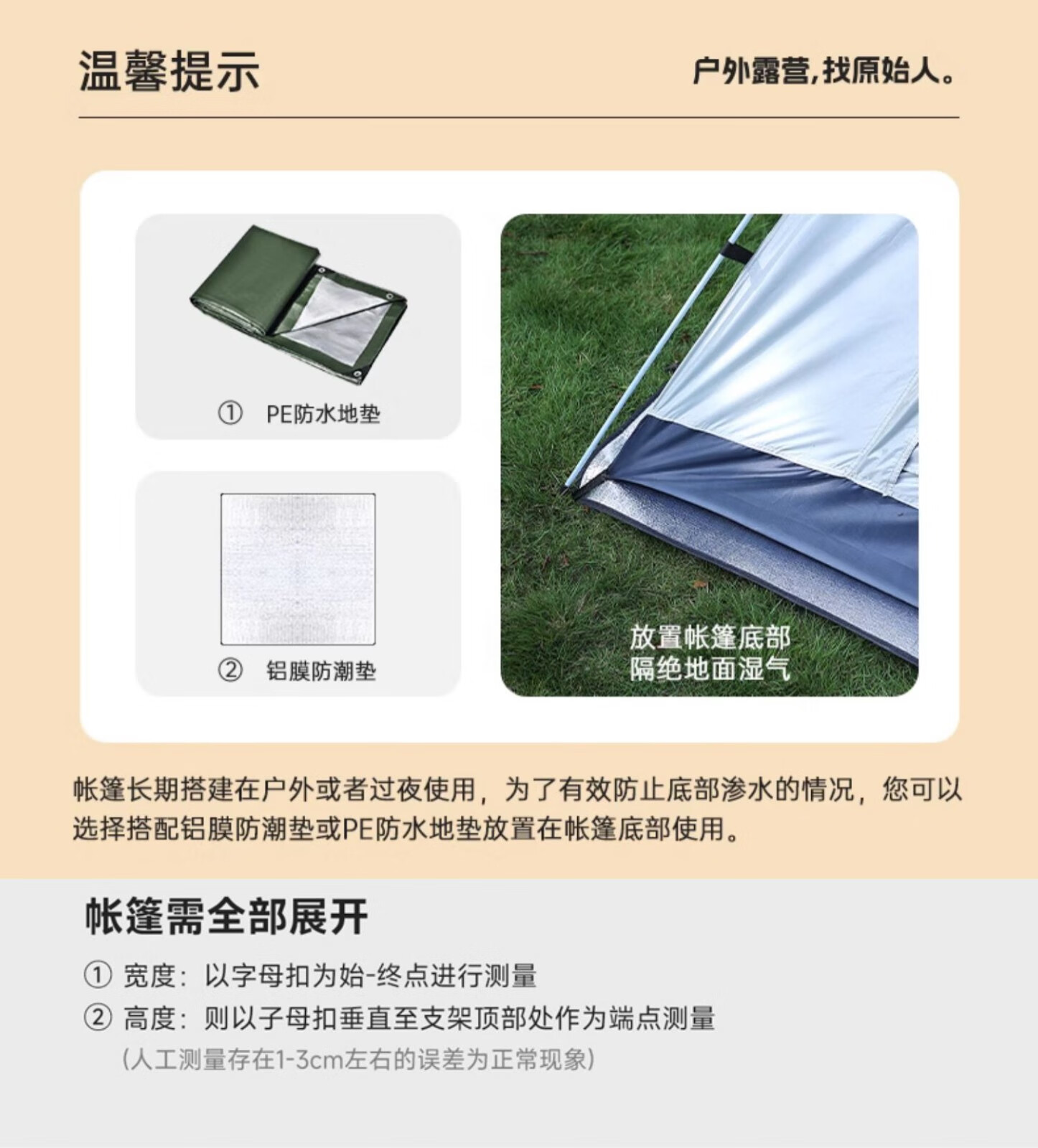 帐篷收到马上先体验安装一下,客服人很好,给个视频看下很好安装,帐篷的质量也非常好,布质感很好摸,没异味,空间也很大哦