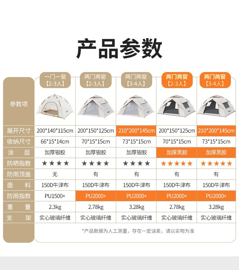 拆装方便,两个人的话建议买大一点儿的。 展开类型:展开都很方便。 便携性能:送的那个包装以及防潮垫都还不错。