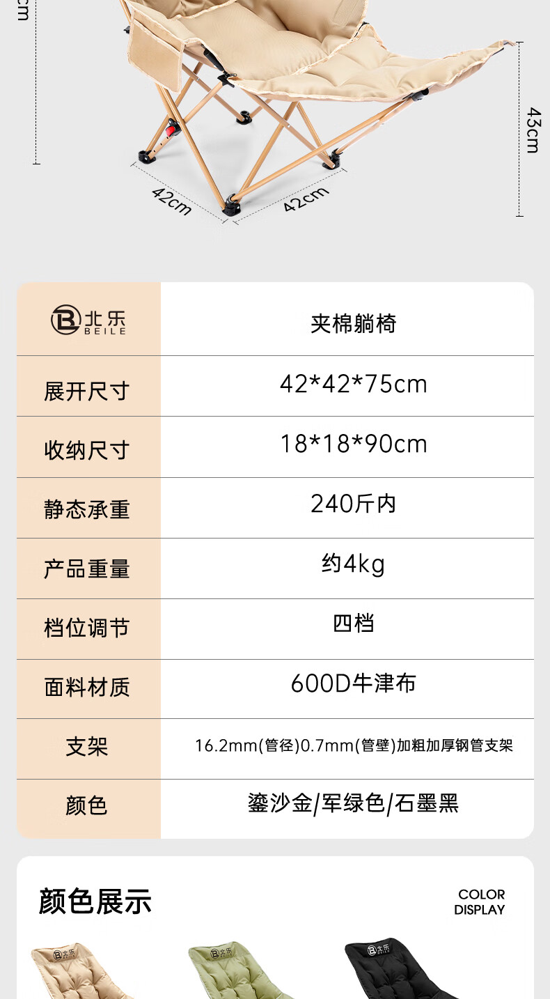 北乐户外露营折叠椅月亮椅便携式午休午睡躺椅沙滩钓鱼野餐野炊椅子 【冬竹青-四挡调节+脚托】-全椅加棉