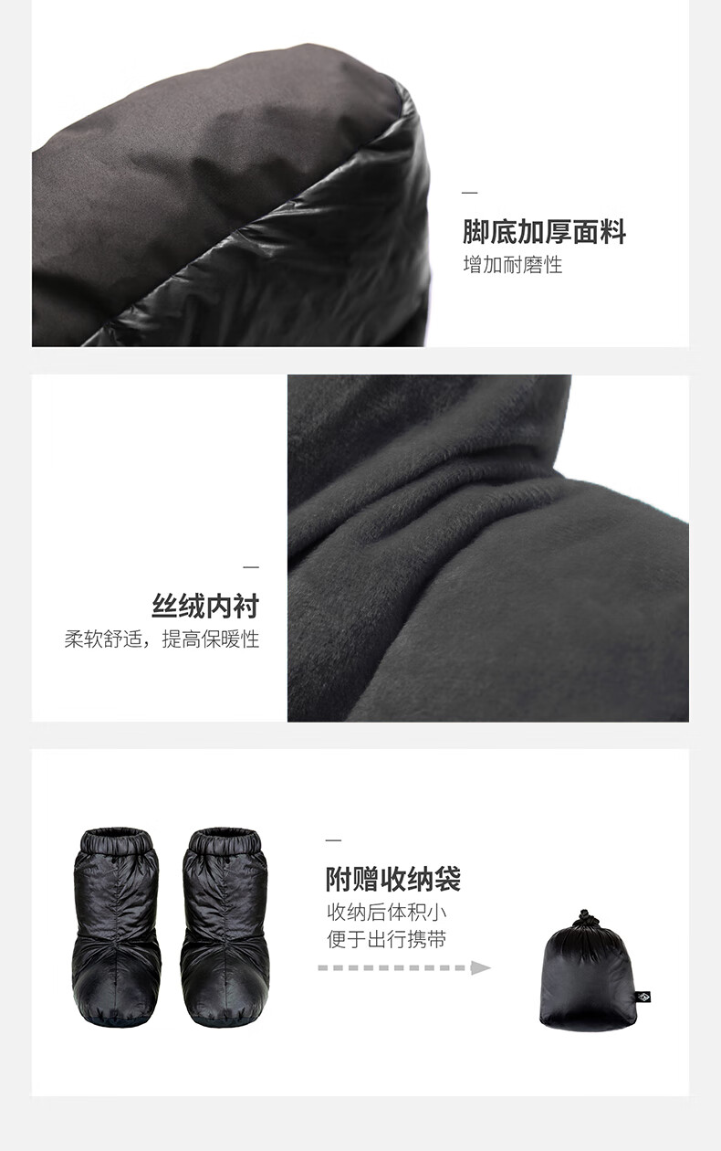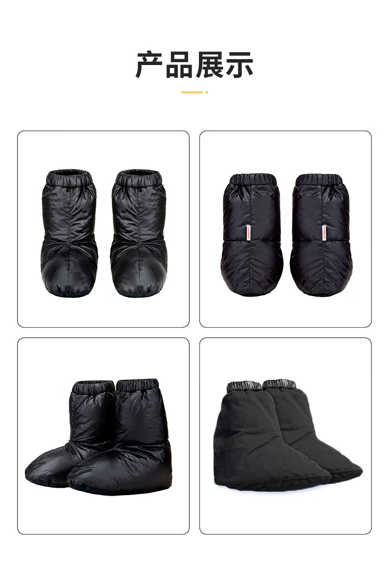 这款黑冰羽绒脚套真的太实用了!蓬松的羽绒填充,保暖性超强,零下低温也能让双脚时刻温暖。轻便又贴合,套在鞋外不臃肿,行走毫无负担。防水面料设计,雨雪天也不怕打湿。细节做工精致,走线工整,性价比超高,户外出行必备好物,强烈推荐!