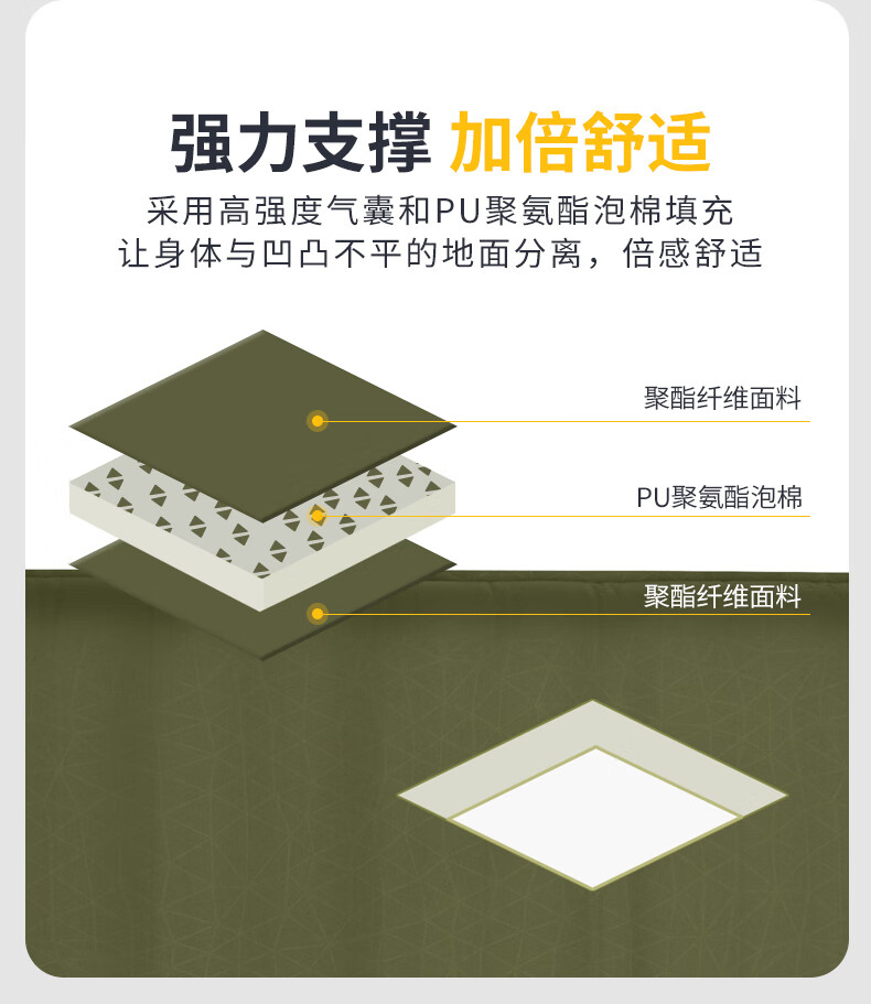 便携性能:卷起来还是比迪家折叠的好收纳,但是纯人工很难恢复到出厂设置。 展开类型:展开后还得需要补点气。足够两人睡了,主要给老婆孩子用,我感觉太软,我用迪家单人的。 容纳人数:2人,三人有点挤。 适用场景:户外,套一个床笠。 防水效果:没测,不透气肯定也放水。 透气效果:不透。