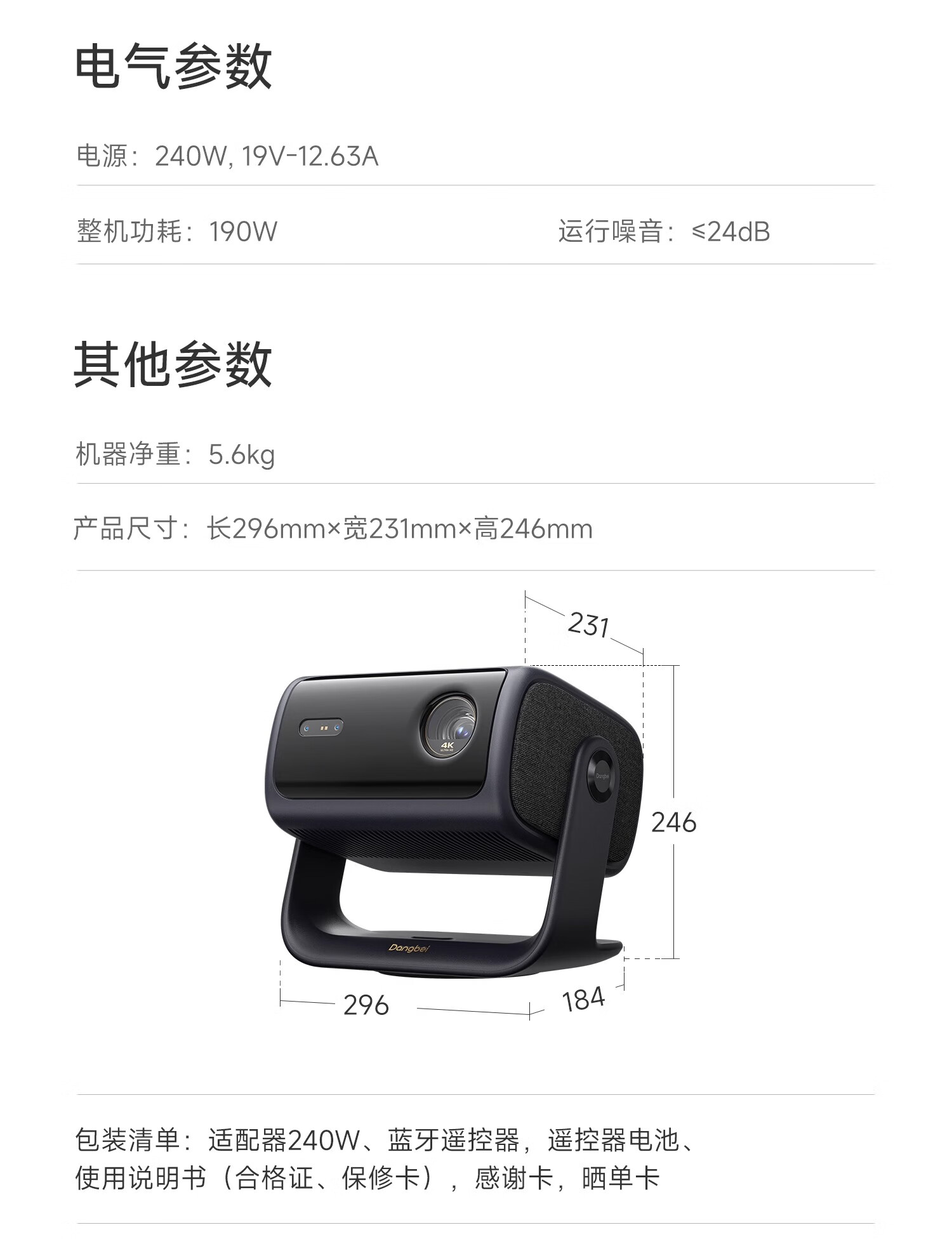 当贝F7 Pro投影仪,电源适配器,遥控器,电池,使用说明书(合格证+保修卡),感谢卡,晒单卡