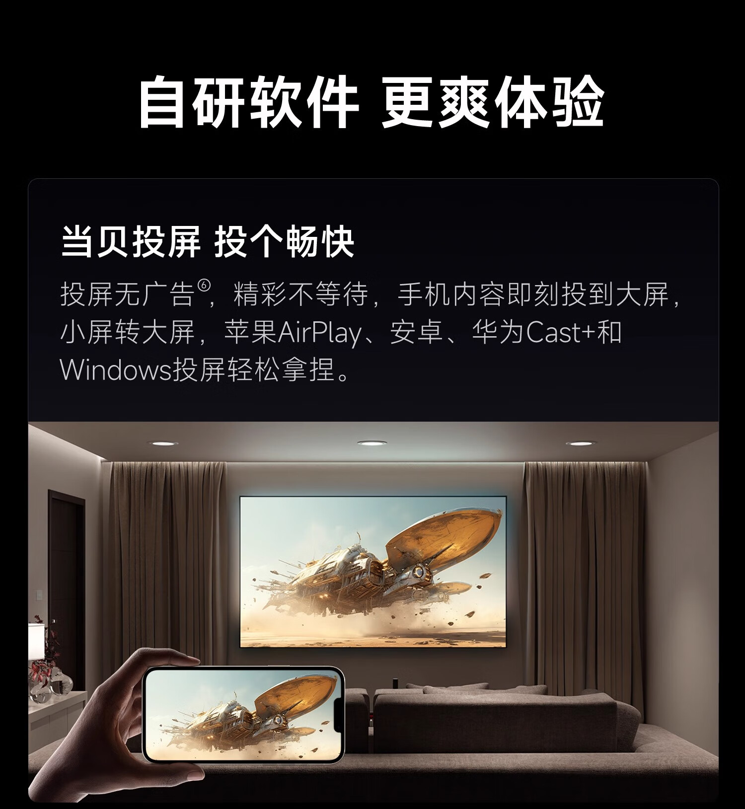 这次购买投影在极米H6和当贝F6之间纠结了很久,最终还是更倾慕F6,机器收到立刻使用了,没想到使用后效果出奇的好,最重要的一点就是4k画质就是超棒,我是白天中午光线最强的时候,幕布还是正面背对窗户,拉了一个不怎么遮光的窗帘,依然可以看的很清楚,画面细腻,色彩自然。系统非常流畅,下载应用速度很快,使用方便,真是物有所值!