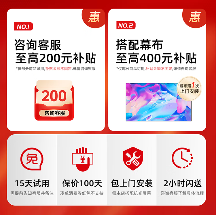 商家发货速度飞快、安装师傅相当专业、有一个角不平,硬是话半个小时调整好了。非常有匠人精神,感谢🙏。也感谢商家给我带来这次购物完美体验! 音质音效:音质是真的棒,墙裂推荐。 投影亮度:看我长得图片,开灯不开灯的都有 投影色彩:亮度日常完全够了,夜晚观影炸裂
