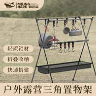 微笑鲨 露营置物架户外便携折叠三角架网兜挂物架晾衣杆灯架野餐支架 中号【挂钩*6+收纳袋】