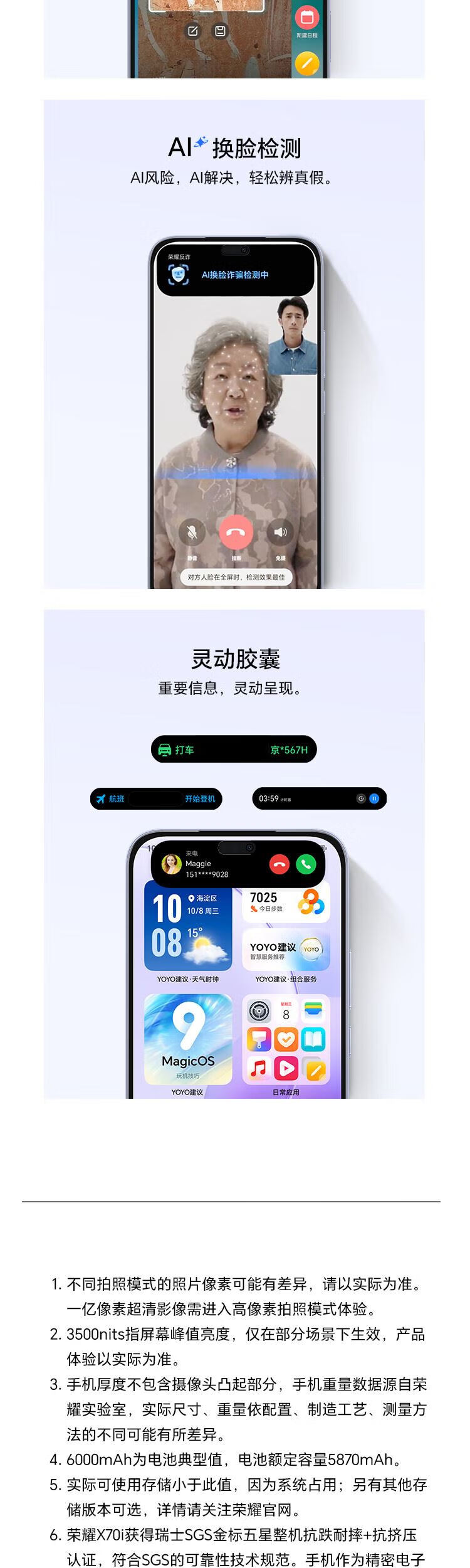 荣耀 X70i 一亿像素【分期免息白条可选】AI拍照键 大屏AI 高亮OLED护眼屏 超轻薄 银发人群5G手机 绒黑色 8GB+256GB 官方标配