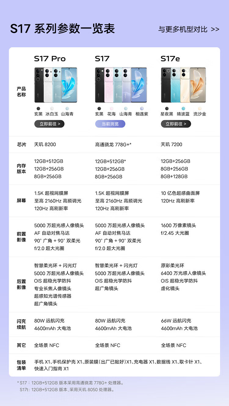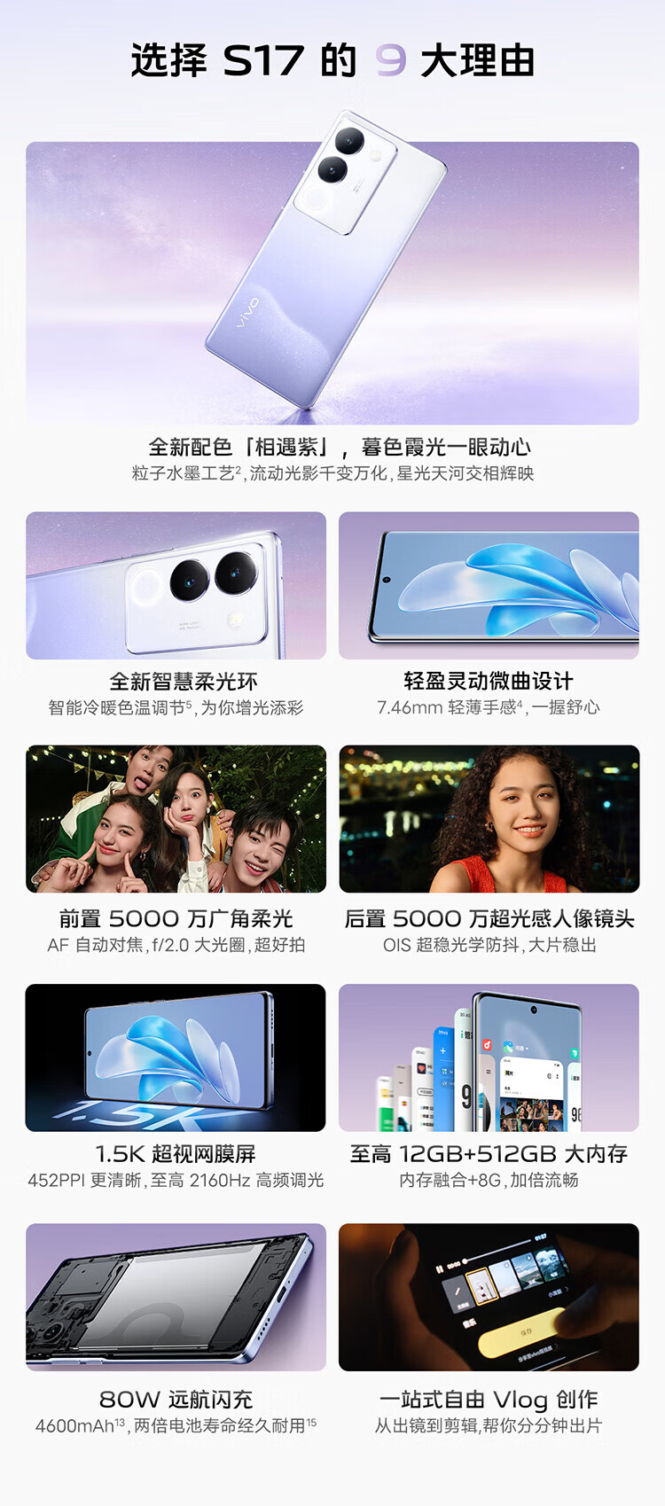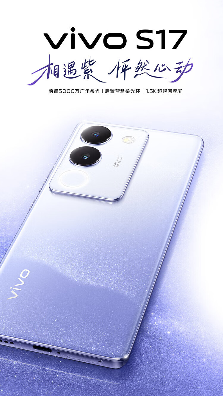 vivoS17 前置5000万广角柔光 后置智慧柔光环 1.5K超视网膜屏 相遇紫 12GB+512GB 单机+第三方品牌+店保1年