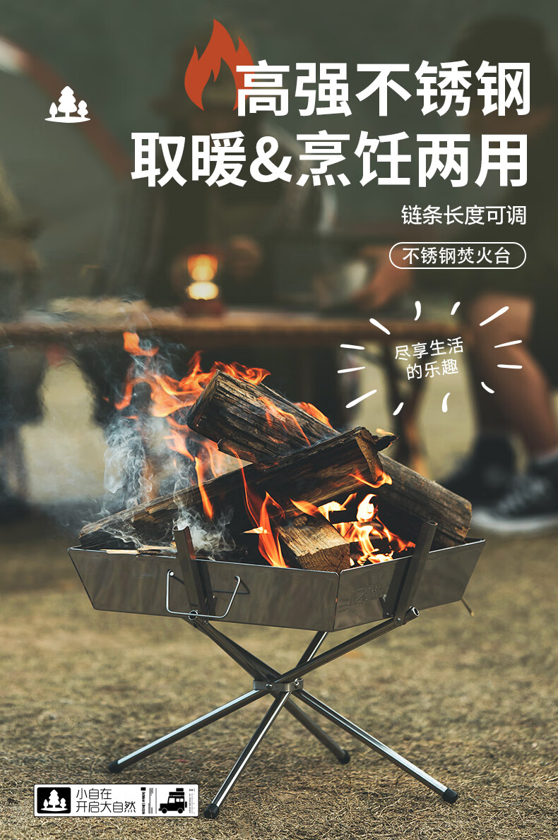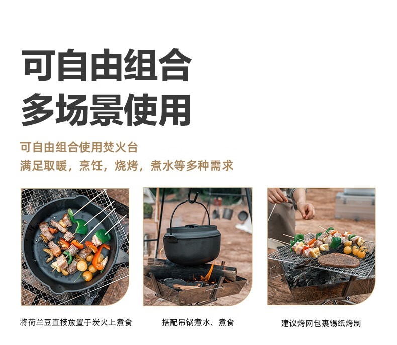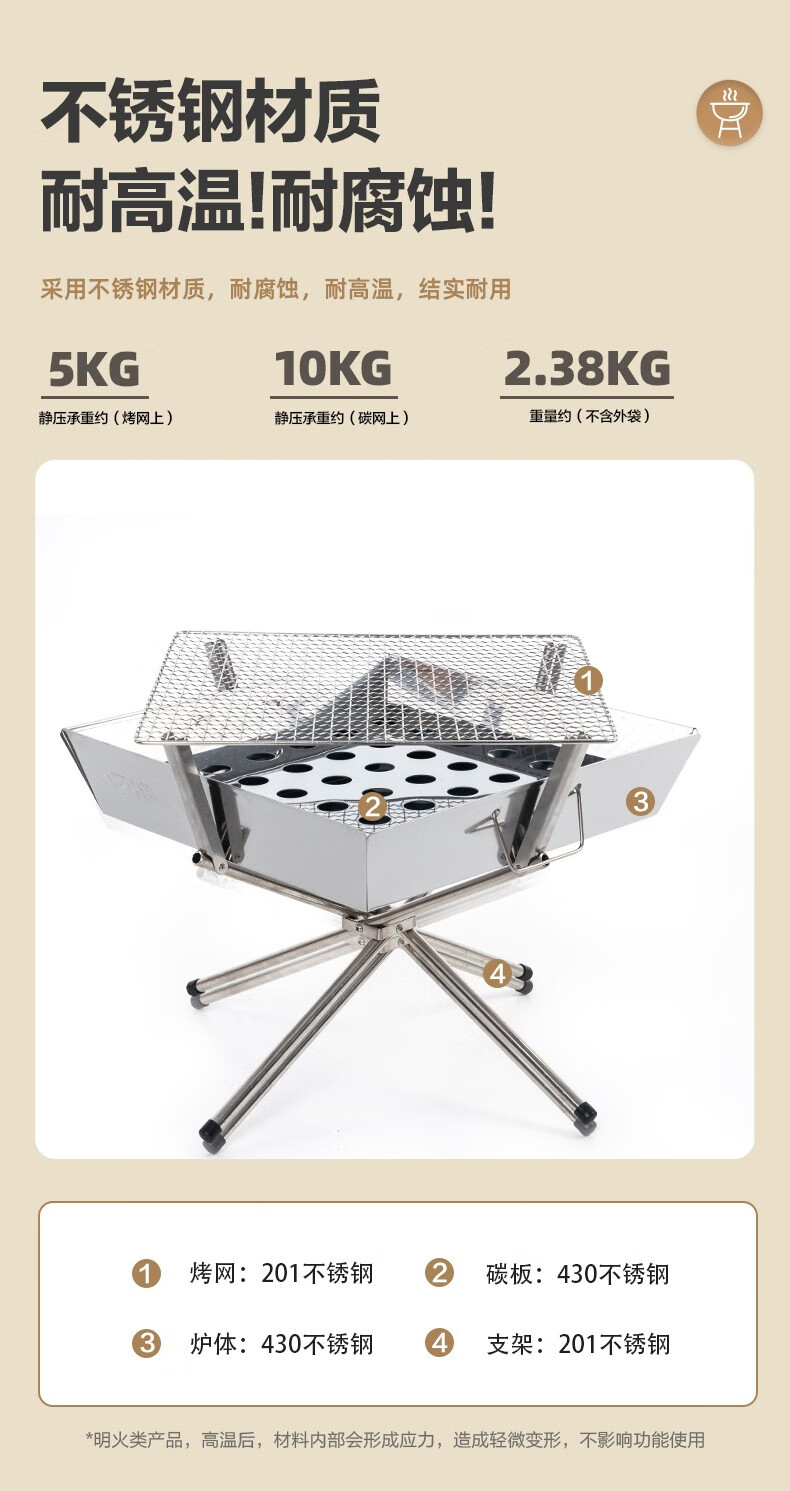 续航时长:挺好的 火力大小:烧柴大火 适用场景:户外休闲娱乐活动 产品做工:非常好👍的做工 适用人数:多次人气 重量大小:非常好👍的用法,有支架可挂个水壶烧水喝,可以用烧烤架烧烤🍗值得