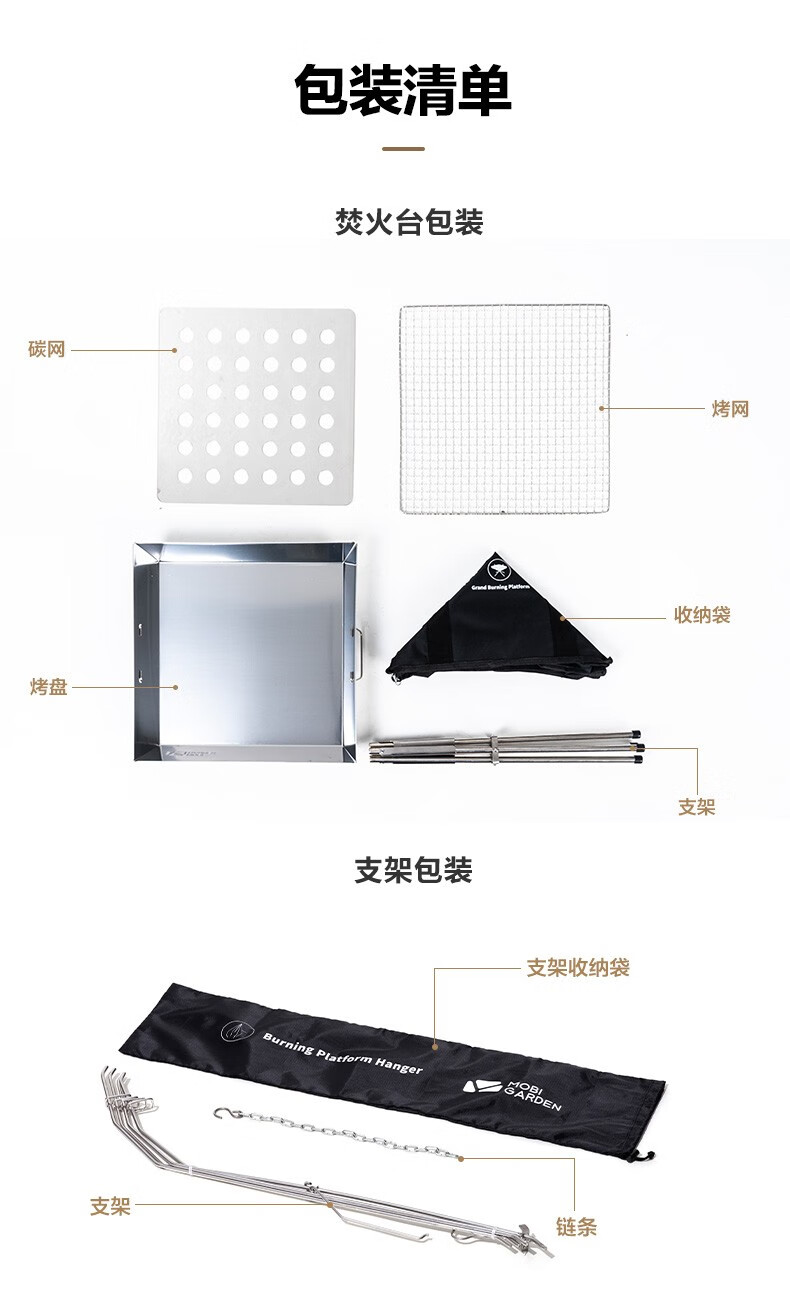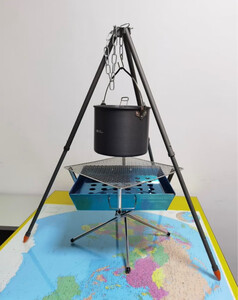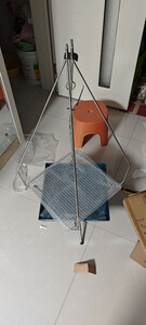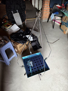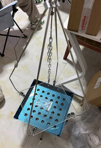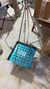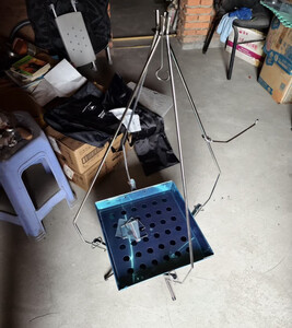 一个焚火台配吊架,拆开看了商品很不错,蛮重的产品,重量蛮好,吊架可以吊大锅煮火锅,下面有考网可以烤肉放烤盘,搭配很不错,值得购入哦。