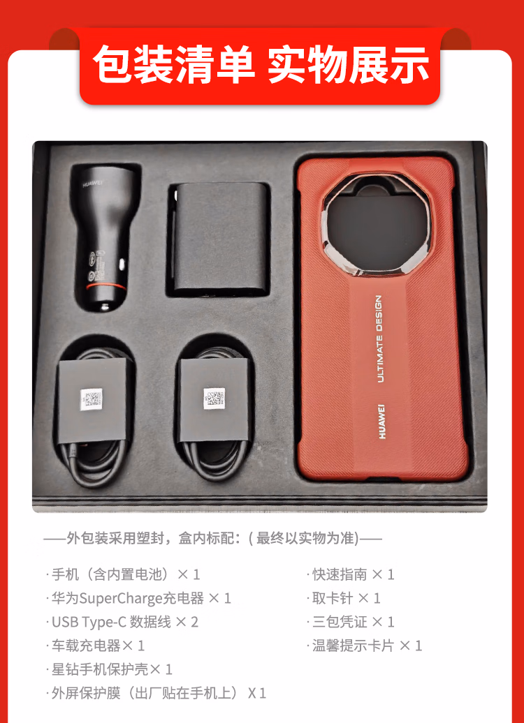 手机(内置电池)X 1;华为充电器 X 1;USB Type-C 数据线 X 2;星钻保护壳 X 1;华为车载快速充电器 X 1;保护膜(出厂已粘贴);快速指南 ;取卡针;三包凭证