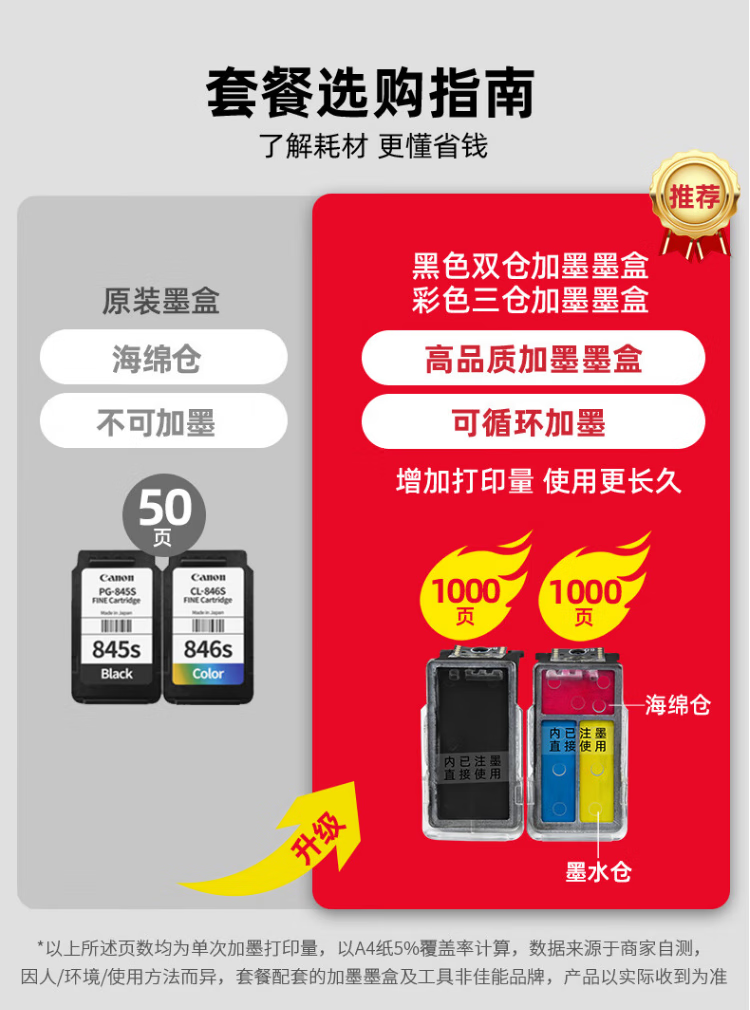 打印机白色的,很好看,平时给家里的宝宝打印作业和照片,墨盒用845和846的,加墨和换墨盒很方便,打印速度也很快,平时有文件可以两分钟就绪