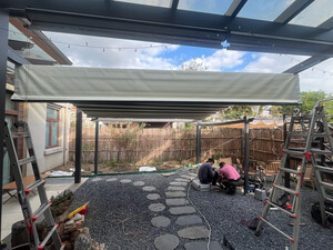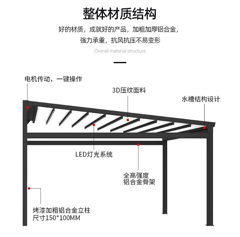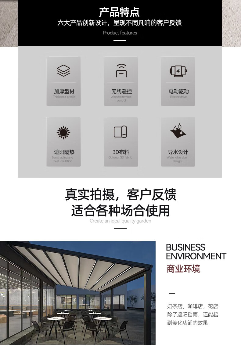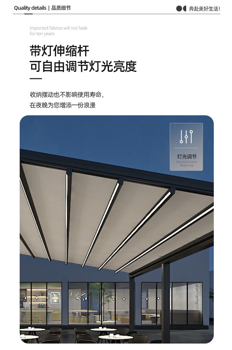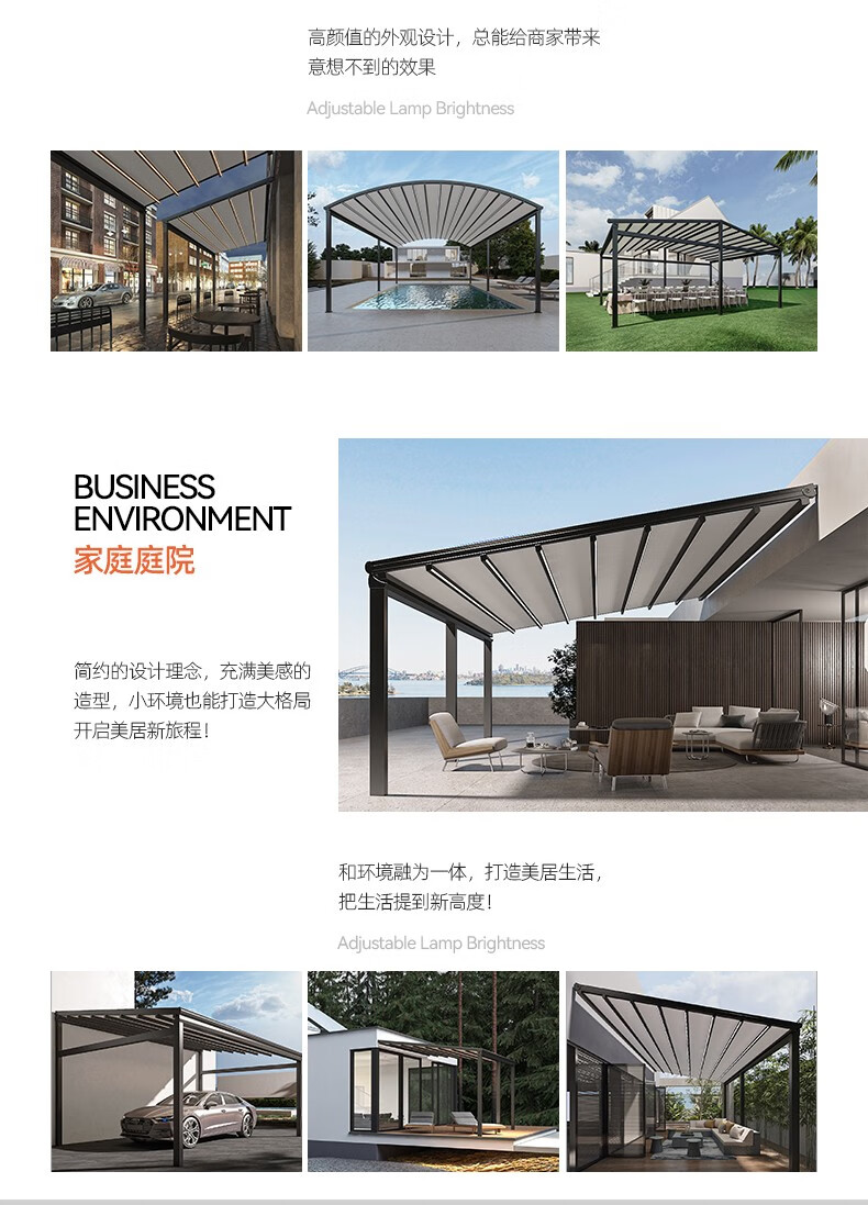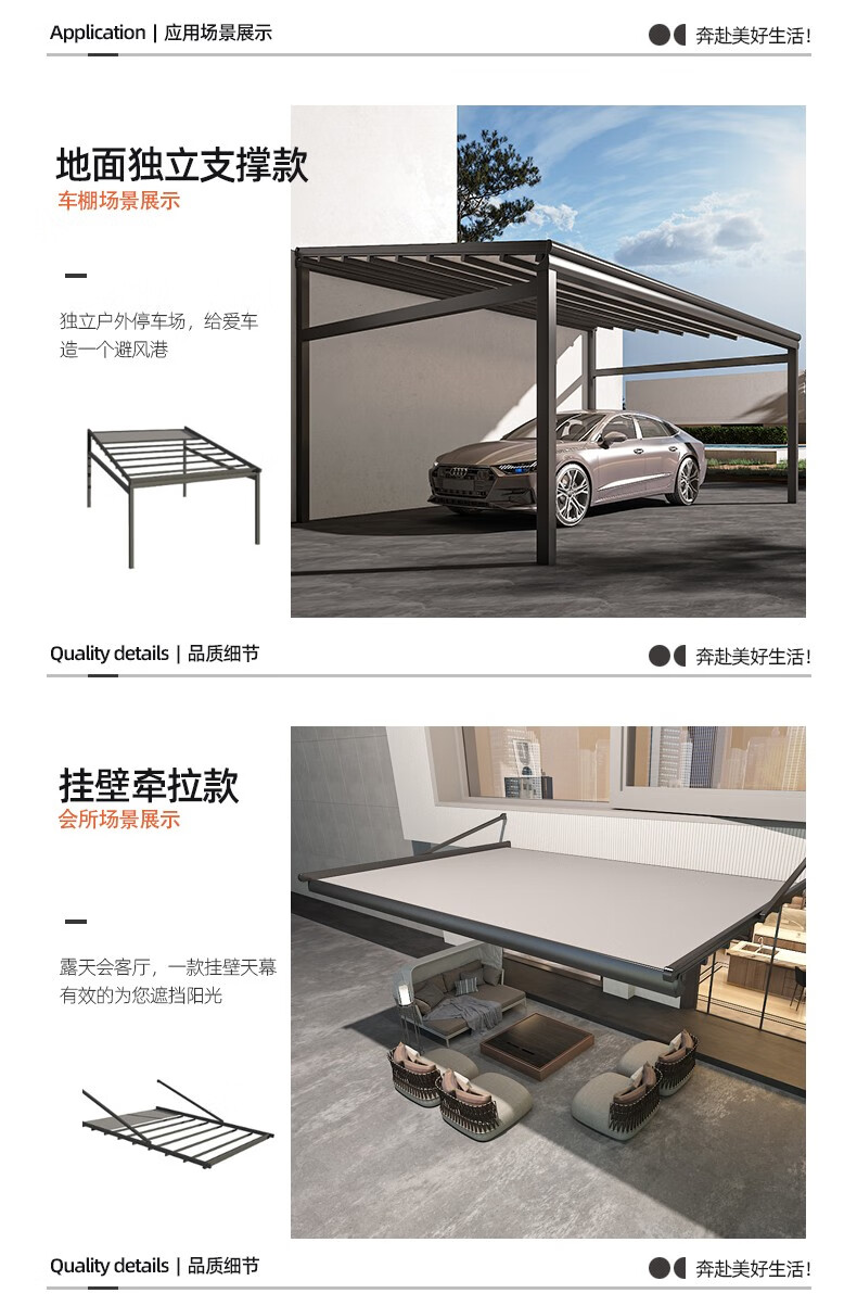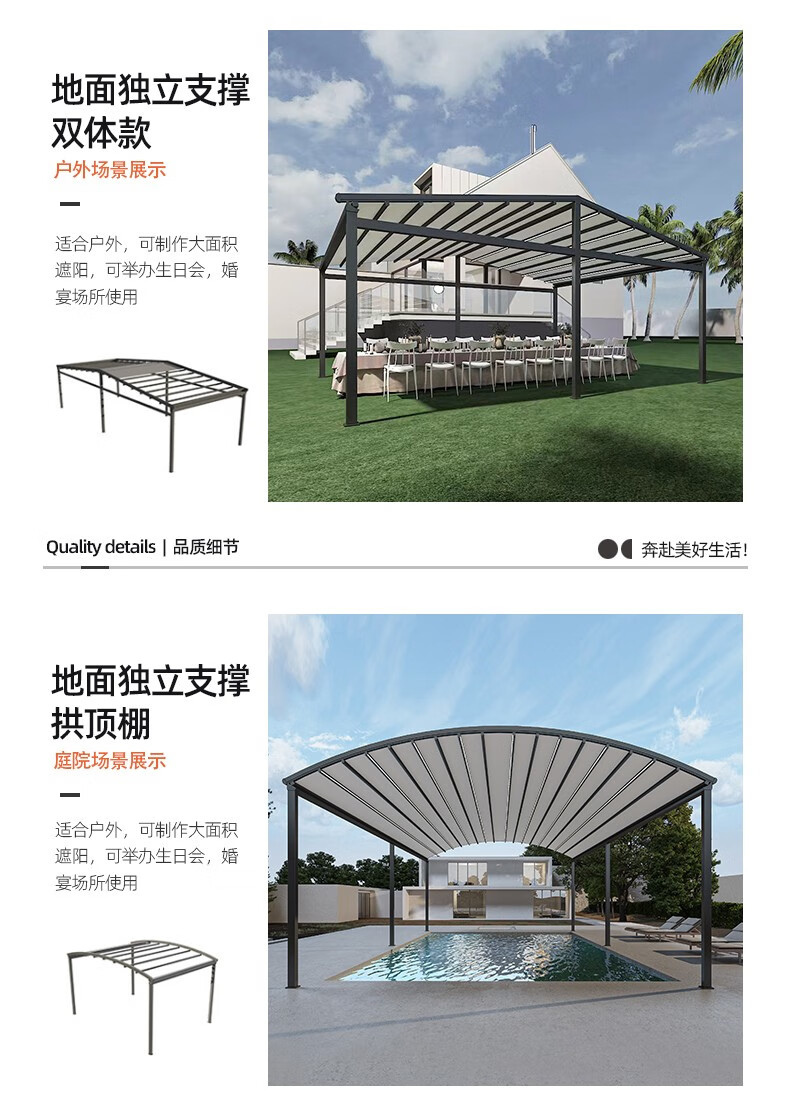 厂家客服热情细心,安装徐师傅专业、经验丰富;让我庭院一方天地,伸缩铝合金天幕开合随心,晴雨皆宜。它以优雅骨架撑起诗意天空,让闲适时光从容流淌。