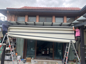 雨棚安装好了,挺满意,再也不用担心下雨了,之前还在纠结是做玻璃的还是这种,现在看来选择对了,可以电动折叠,白天放出来遮阳和挡雨,晚上可以直接折叠起来,很方便也很实用,价格也比玻璃便宜,另外这个导水设计非常实用,我们邻居看到装得漂亮也让师傅帮忙测量尺寸回去定做啦