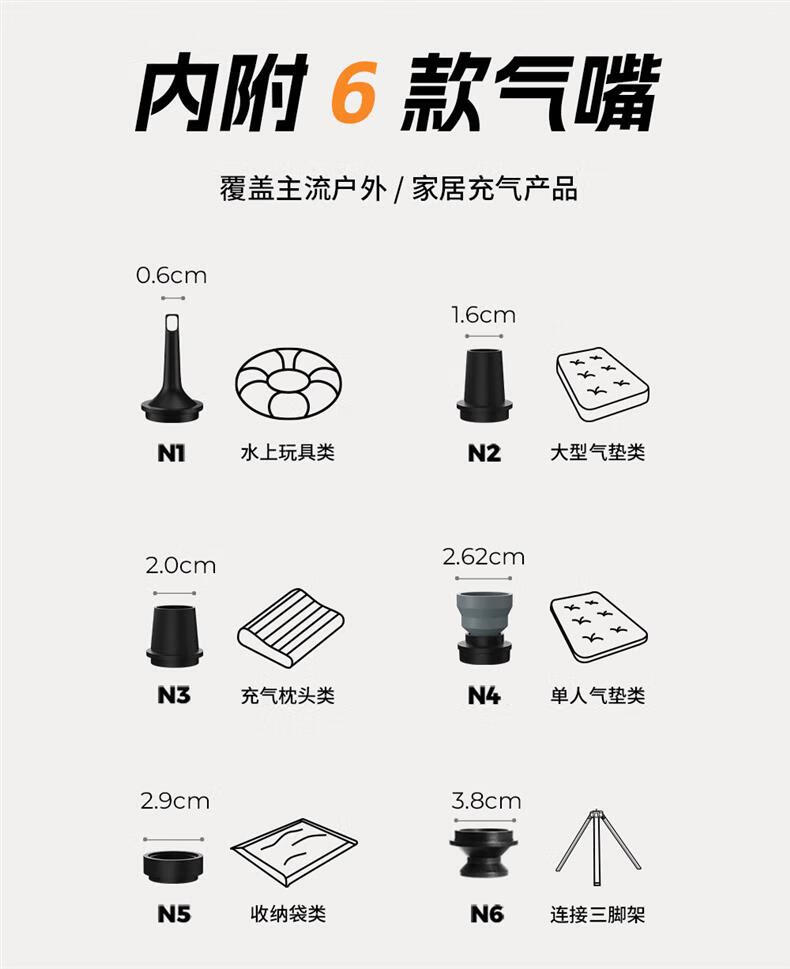 很不错的一个产品,手掌大小,做工精致,配了多种充气口,睡垫泳圈都能用,适用性强,而且充气很快,一个单人床垫,30秒左右就能完成,有赠送收纳袋,方便外出携带。