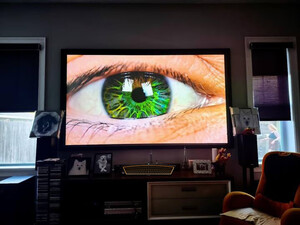 我家3.8米100很合适,用了几天感觉效果很好。手机拍不出来效果得现场体验,满意。画面晚上尤其清晰,不刺眼,尤其看大自然景色感觉比液晶电视色彩鲜艳。音响效果听歌和看电影大片好。重点是给家里小孩看不伤眼睛,一次超满意的购买。值得拥有~