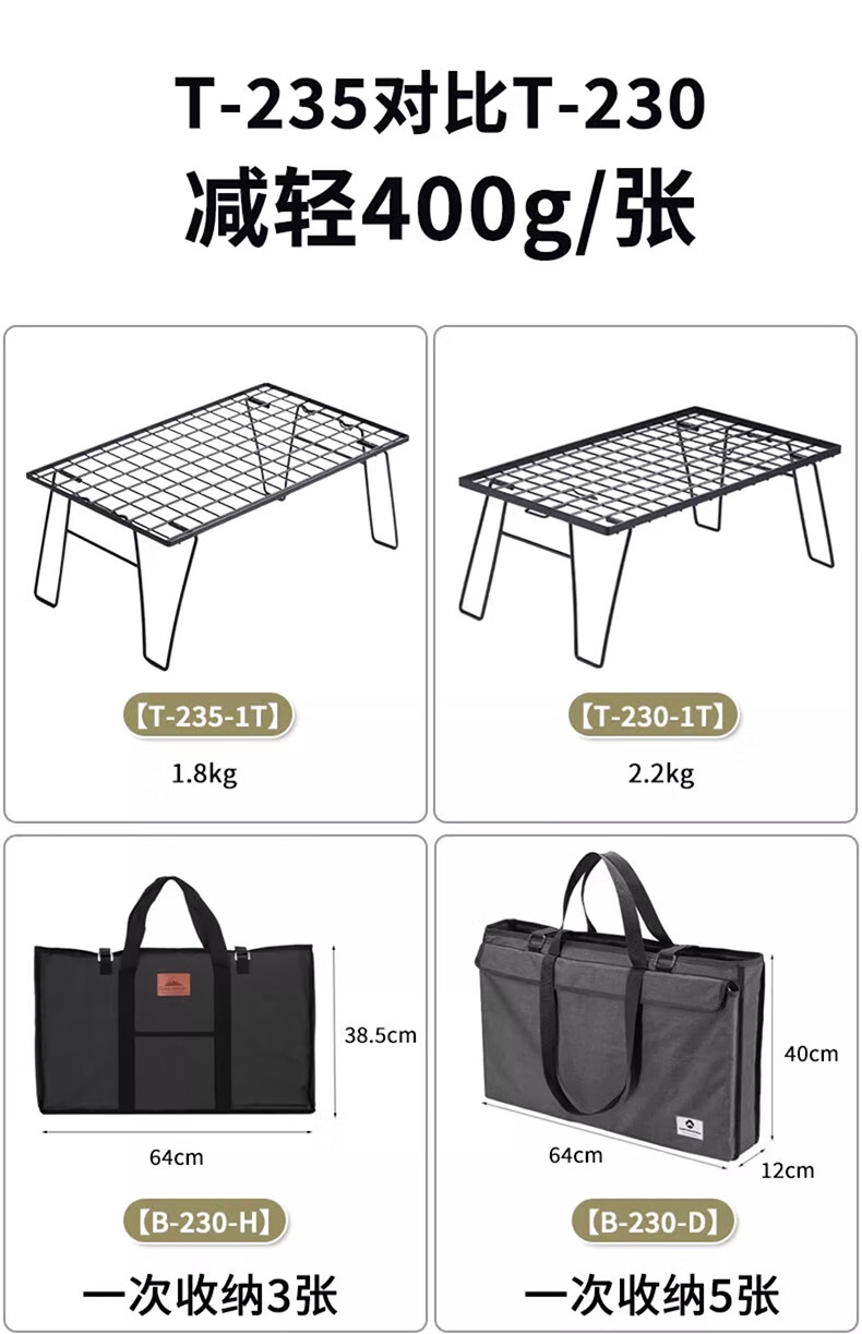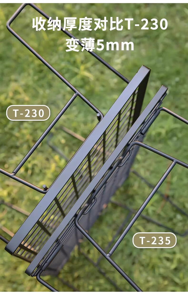上层是刚刚买的T235,比下层的T233确实轻便了不少,T235手感是磨砂的,和卡其色光面漆的T233手感完全不一样。另外,网桌支架增加了阻尼,角度可以限位,不像T233那样在撑开支楞起来的时候咣当响,还更安全,不打到手脚。整体来说性价比越来越高了,那么出去我是不是要抛弃T233而只带T235呢,毕竟轻量化是户外必要的考虑因素😲