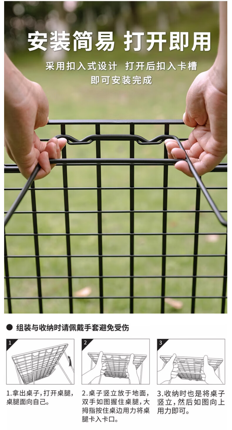 小桌子可以折叠,用料扎实,手感份量特别足,打开以后非常稳定,不会晃动不会倾斜,户外露营非常实用,建议广大同学购买,价格不贵,就是好用。