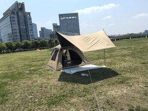 帐篷尺寸很大,三个人完全没问题,隔热效果不错,撑开也很简单,按照方向一撑就开,收起来也很方便,天幕是拉链连接到帐篷的,场地小没地方撑天幕,得很大的空地才行,里面自带防潮垫,很不错