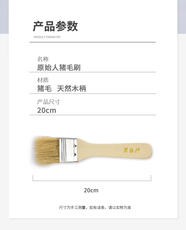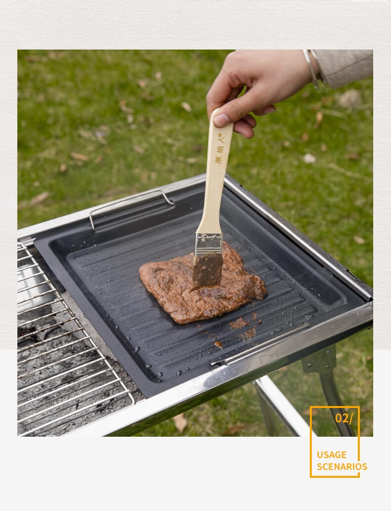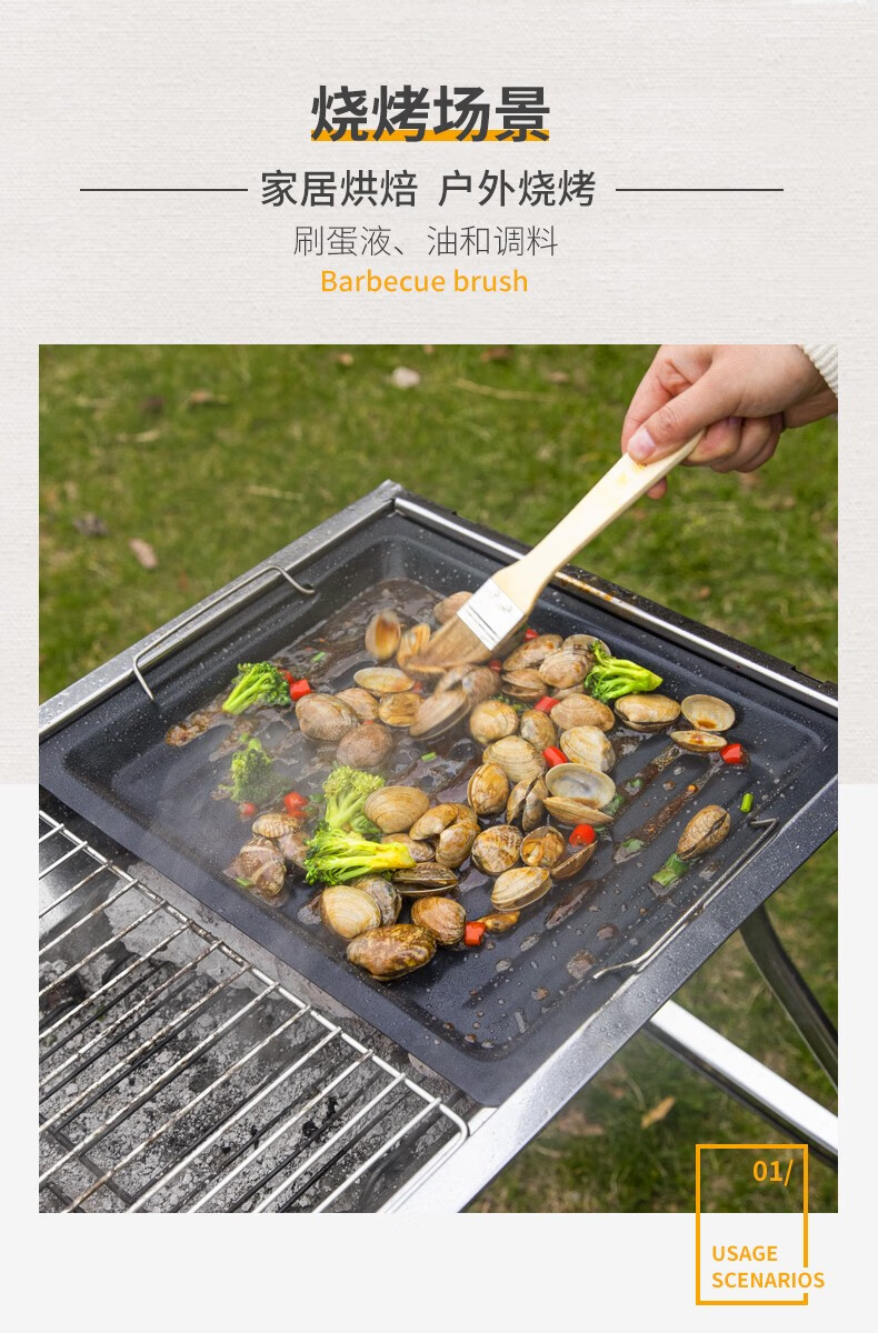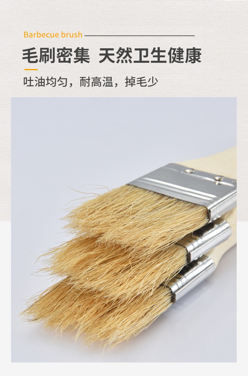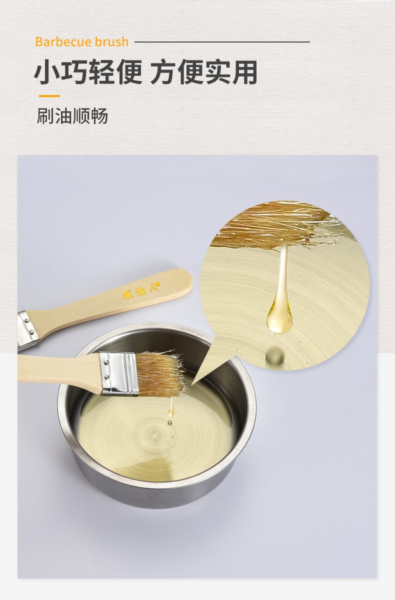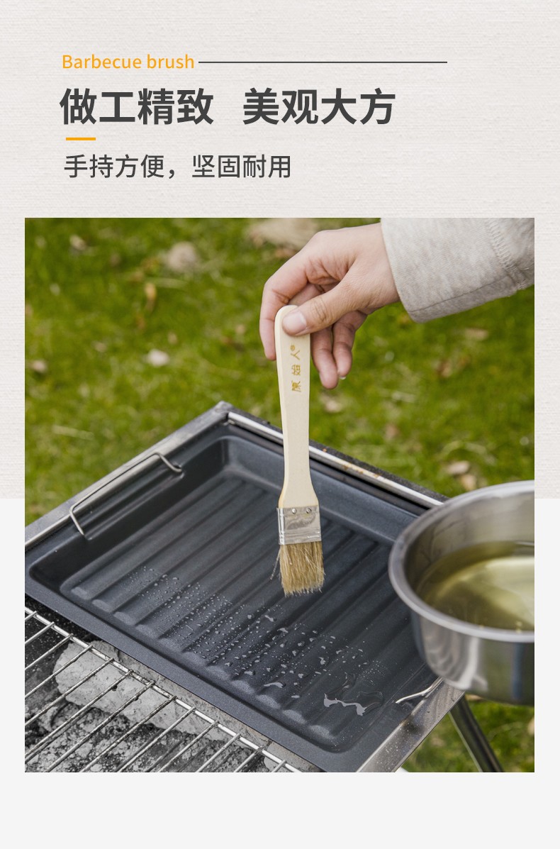 室内室外:室外最好,室内也可 用料材质:木制柄,猪毛刷子 适用人数:6-8人主要用于涂抹烧烤料,很方便主要是卫生 重量大小:很轻但是结实,烤蔬菜和火腿肠等等但是肉类一般直接撒用烧烤罐子就可 热源类型:明火电烤都行但是火不要太大,容易把肉和工具都搞坏了,掌握一个最温和的火候,把剩下的交给时间 便携性能:很不错易清洁,用过几次不会掉毛