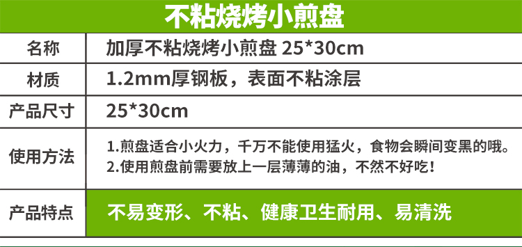 用料材质:材质可以 很好 不粘锅 室内室外:室外使用 适用人数:3-4个人 俩人烤 重量大小:有份量 很厚 热源类型:反正不粘锅 便携性能:方便携带