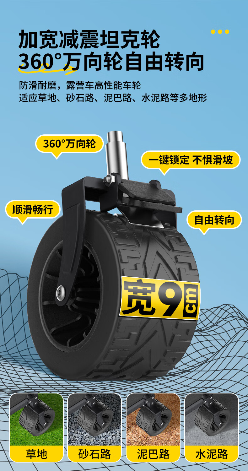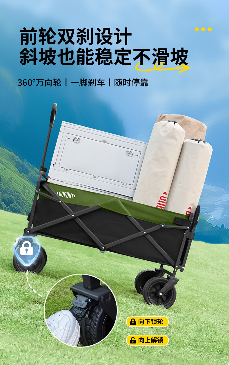 杜邦露营车质量很好!露营,搬家,购物用着非常方便,承重力强,轮子宽度和质量看着也非常好!还有水杯放置的专门袋子,设计非常贴心