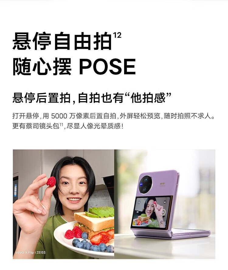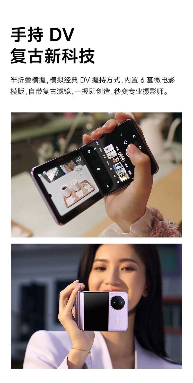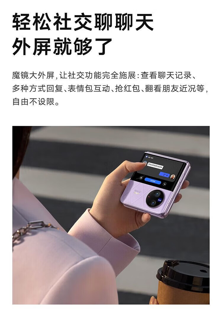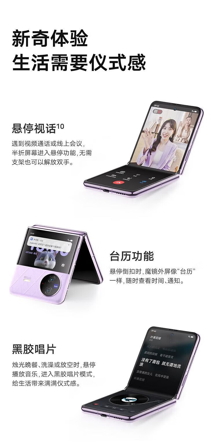 vivo X Flip 轻巧优雅设计 魔镜大外屏 悬停蔡司影像 骁龙8+ 芯片 5G 折叠屏手机 xflip 菱紫 12GB+256GB 官方标配+原封未激活+全国联保